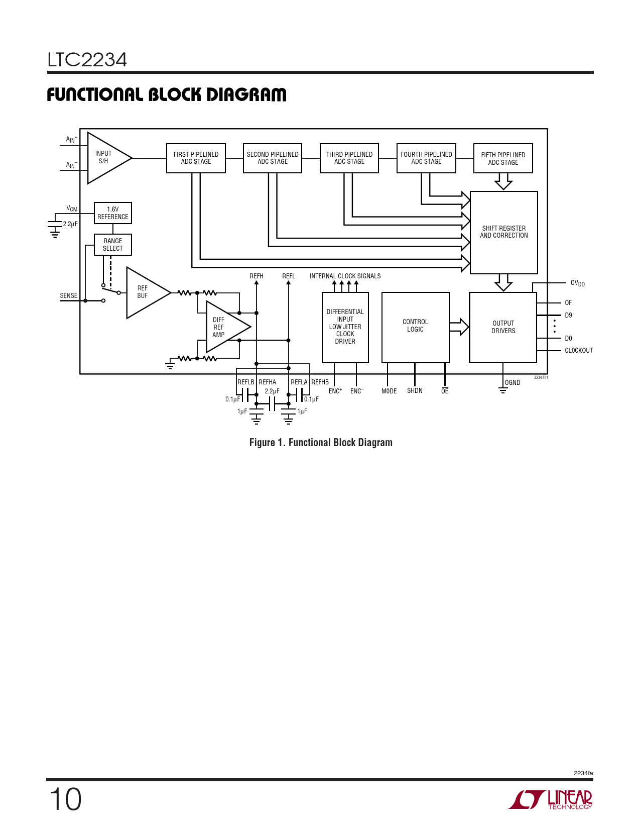 A + IN INPUT FIRST PIPELINED SECOND PIPELINED THIRD PIPELINED FOURTH PIPELINED FIFTH PIPELINED – S/H A ADC STAGE ADC STAGE ADC STAGE ADC STAGE ADC STAGE IN VCM 1.6V REFERENCE 2.2µF SHIFT REGISTER AND CORRECTION RANGE SELECT REFH REFL INTERNAL CLOCK SIGNALS OVDD REF SENSE BUF OF DIFFERENTIAL D9 DIFF INPUT CONTROL OUTPUT • REF LOW JITTER LOGIC • DRIVERS AMP CLOCK • D0 DRIVER CL0CKOUT 2234 F01 REFLB REFHA REFLA REFHB OGND 2.2µF ENC+ ENC– M0DE SHDN OE 0.1µF 0.1µF 1µF 1µF
