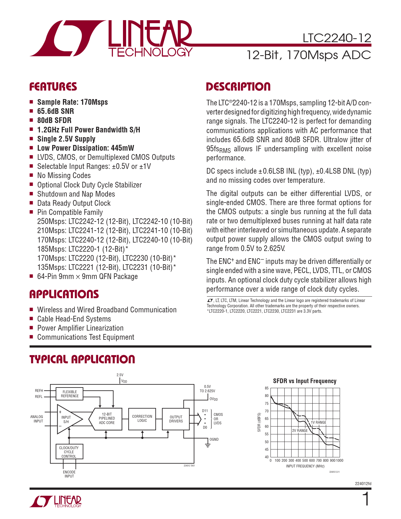L, LT, LTC, LTM, Linear Technology and the Linear logo are registered trademarks of Linear Technology Corporation. All other trademarks are the property of their respective owners. n Wireless and Wired Broadband Communication *LTC2220-1, LTC2220, LTC2221, LTC2230, LTC2231 are 3.3V parts. n Cable Head-End Systems n Power Amplifi er Linearization n Communications Test Equipment