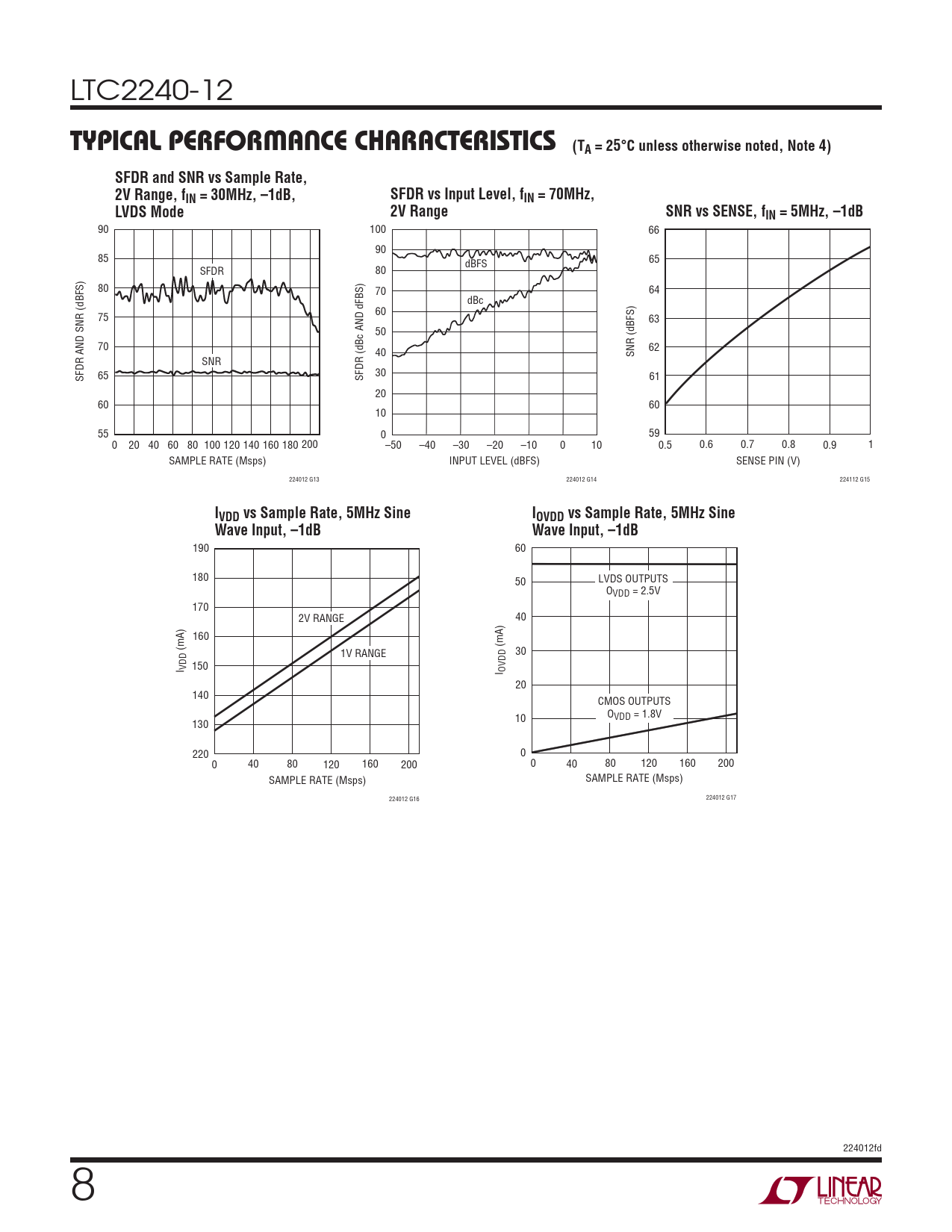 90 100 66 90 85 dBFS 65 SFDR 80 80 70 64 dBc 60 75 63 50 70 40 62 SNR (dBFS) SNR SFDR AND SNR (dBFS) 65 SFDR (dBc AND dFBS) 30 61 20 60 60 10 55 0 59 0 20 40 60 80 100 120 140 160 180 200 –50 –40 –30 –20 –10 0 10 0.5 0.6 0.7 0.8 0.9 1 SAMPLE RATE (Msps) INPUT LEVEL (dBFS) SENSE PIN (V) 224012 G13 224012 G14 224112 G15