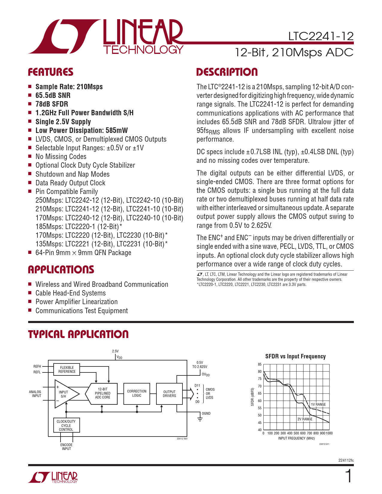 LTC2241-12 12-Bit, 210Msps ADC FeaTuresDescripTion n Sample Rate: 210Msps The LTC®2241-12 is a 210Msps, sampling 12-bit A/D con- n 65.5dB SNR verter designed for digitizing high frequency, wide dynamic n 78dB SFDR range signals. The LTC2241-12 is perfect for demanding n 1.2GHz Full Power Bandwidth S/H communications applications with AC performance that n Single 2.5V Supply includes 65.5dB SNR and 78dB SFDR. Ultralow jitter of n Low Power Dissipation: 585mW 95fsRMS allows IF undersampling with excellent noise n LVDS, CMOS, or Demultiplexed CMOS Outputs performance. n Selectable Input Ranges: ±0.5V or ±1V DC specs include ±0.7LSB INL (typ), ±0.4LSB DNL (typ) n No Missing Codes and no missing codes over temperature. n Optional Clock Duty Cycle Stabilizer n Shutdown and Nap Modes The digital outputs can be either differential LVDS, or n Data Ready Output Clock single-ended CMOS. There are three format options for n Pin Compatible Family the CMOS outputs: a single bus running at the full data 250Msps: LTC2242-12 (12-Bit), LTC2242-10 (10-Bit) rate or two demultiplexed buses running at half data rate 210Msps: LTC2241-12 (12-Bit), LTC2241-10 (10-Bit) with either interleaved or simultaneous update. A separate 170Msps: LTC2240-12 (12-Bit), LTC2240-10 (10-Bit) output power supply allows the CMOS output swing to 185Msps: LTC2220-1 (12-Bit)* range from 0.5V to 2.625V. 170Msps: LTC2220 (12-Bit), LTC2230 (10-Bit)* The ENC+ and ENC– inputs may be driven differentially or 135Msps: LTC2221 (12-Bit), LTC2231 (10-Bit)* single ended with a sine wave, PECL, LVDS, TTL, or CMOS n 64-Pin 9mm × 9mm QFN Package inputs. An optional clock duty cycle stabilizer allows high applicaTions performance over a wide range of clock duty cycles. L, LT, LTC, LTM, Linear Technology and the Linear logo are registered trademarks of Linear Technology Corporation. All other trademarks are the property of their respective owners. n Wireless and Wired Broadband Communication *LTC2220-1, LTC2220, LTC2221, LTC2230, LTC2231 are 3.3V parts. n Cable Head-End Systems n Power Amplifier Linearization n Communications Test Equipment Typical applicaTion 2.5V VDD SFDR vs Input Frequency 0.5V 85 REFH FLEXIBLE TO 2.625V REFL REFERENCE 80 OVDD 75 + D11 70 12-BIT • ANALOG CMOS INPUT CORRECTION OUTPUT PIPELINED • 65 INPUT OR S/H LOGIC DRIVERS ADC CORE – • LVDS D0 60 SFDR (dBFS) 1V RANGE 55 OGND 50 2V RANGE CLOCK/DUTY 45 CYCLE CONTROL 40 0 100 200 300 400 500 600 700 800 9001000 224112 TA01 INPUT FREQUENCY (MHz) ENCODE 224112 G11 INPUT 224112fc 1 Document Outline Features Applications Description Typical Application Absolute Maximum Ratings Pin Configuration Order Information Converter Characteristics Analog Input Dynamic Accuracy Internal Reference Characteristics Digital Inputs and Digital Outputs Power Requirements Timing Characteristics Electrical Characteristics Typical Performance Characteristics Pin Functions Functional Block Diagram Timing Diagrams Applications Information Package Description Revision History Related Parts