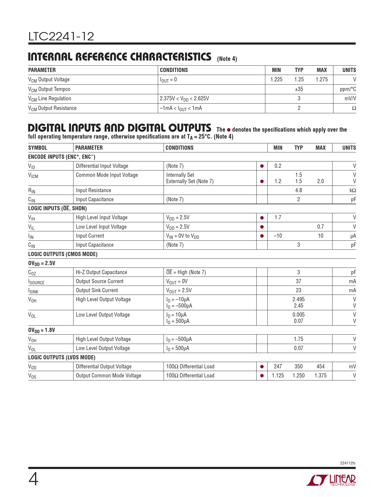LTC2241-12 inTernal reFerence characTerisTics (Note 4)PARAMETERCONDITIONSMINTYPMAXUNITS VCM Output Voltage IOUT = 0 1.225 1.25 1.275 V VCM Output Tempco ±35 ppm/°C VCM Line Regulation 2.375V < VDD < 2.625V 3 mV/V VCM Output Resistance –1mA < IOUT < 1mA 2 Ω DigiTal inpuTs anD DigiTal ouTpuTs The ● denotes the specifications which apply over thefull operating temperature range, otherwise specifications are at TA = 25°C. (Note 4) SYMBOLPARAMETERCONDITIONSMINTYPMAXUNITSENCODE INPUTS (ENC+, ENC–) VID Differential Input Voltage (Note 7) ● 0.2 V VICM Common Mode Input Voltage Internally Set 1.5 V Externally Set (Note 7) ● 1.2 1.5 2.0 V RIN Input Resistance 4.8 kΩ CIN Input Capacitance (Note 7) 2 pF LOGIC INPUTS (OE, SHDN) VIH High Level Input Voltage VDD = 2.5V ● 1.7 V VIL Low Level Input Voltage VDD = 2.5V ● 0.7 V IIN Input Current VIN = 0V to VDD ● –10 10 µA CIN Input Capacitance (Note 7) 3 pF LOGIC OUTPUTS (CMOS MODE) OVDD = 2.5V COZ Hi-Z Output Capacitance OE = High (Note 7) 3 pF ISOURCE Output Source Current VOUT = 0V 37 mA ISINK Output Sink Current VOUT = 2.5V 23 mA VOH High Level Output Voltage IO = –10µA 2.495 V IO = –500µA 2.45 V VOL Low Level Output Voltage IO = 10µA 0.005 V IO = 500µA 0.07 V OVDD = 1.8V VOH High Level Output Voltage IO = –500µA 1.75 V VOL Low Level Output Voltage IO = 500µA 0.07 V LOGIC OUTPUTS (LVDS MODE) VOD Differential Output Voltage 100Ω Differential Load ● 247 350 454 mV VOS Output Common Mode Voltage 100Ω Differential Load ● 1.125 1.250 1.375 V 224112fc 4 Document Outline Features Applications Description Typical Application Absolute Maximum Ratings Pin Configuration Order Information Converter Characteristics Analog Input Dynamic Accuracy Internal Reference Characteristics Digital Inputs and Digital Outputs Power Requirements Timing Characteristics Electrical Characteristics Typical Performance Characteristics Pin Functions Functional Block Diagram Timing Diagrams Applications Information Package Description Revision History Related Parts