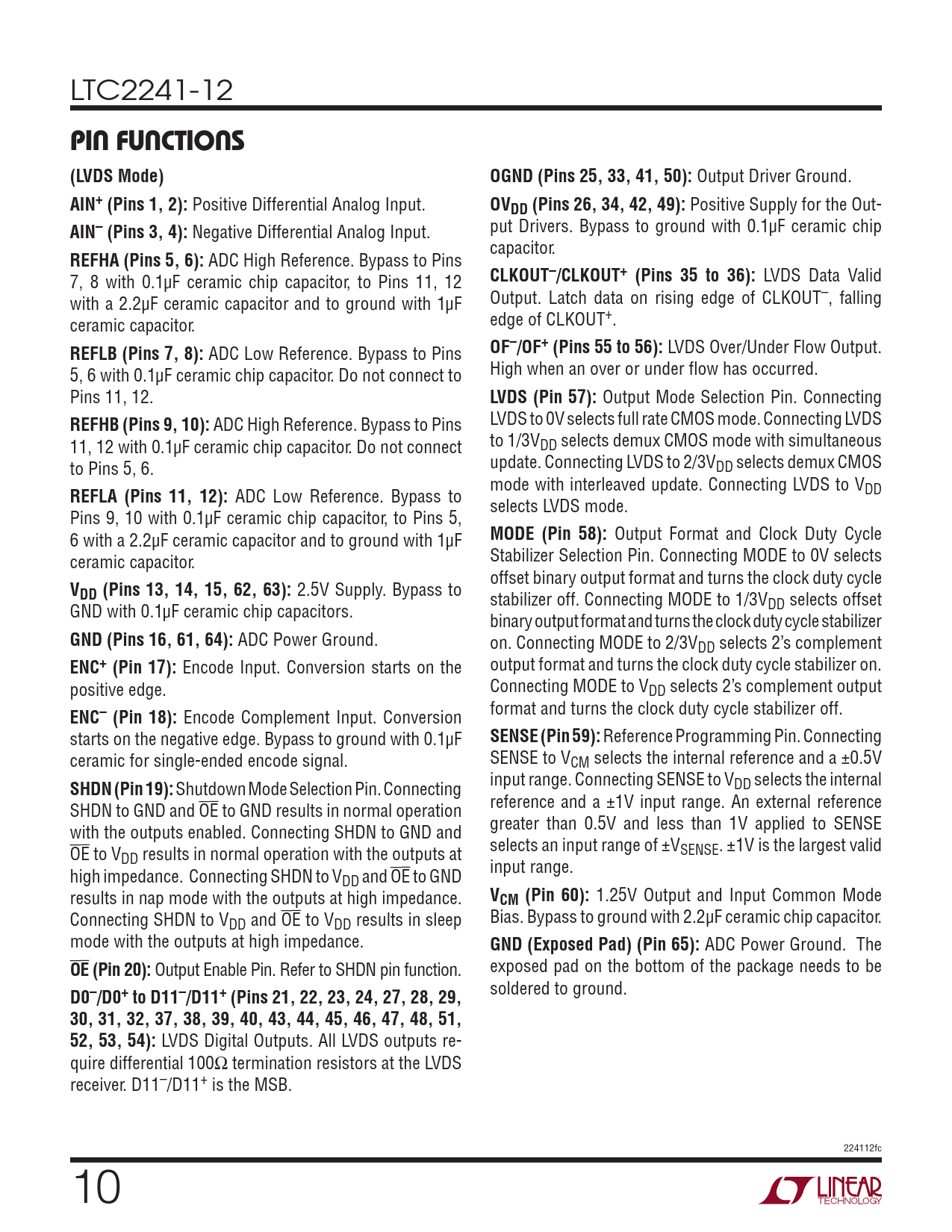 LTC2241-12 pin FuncTions (LVDS Mode)OGND (Pins 25, 33, 41, 50): Output Driver Ground. AIN+ (Pins 1, 2): Positive Differential Analog Input. OVDD (Pins 26, 34, 42, 49): Positive Supply for the Out- AIN– (Pins 3, 4): Negative Differential Analog Input. put Drivers. Bypass to ground with 0.1µF ceramic chip capacitor. REFHA (Pins 5, 6): ADC High Reference. Bypass to Pins 7, 8 with 0.1µF ceramic chip capacitor, to Pins 11, 12 CLKOUT–/CLKOUT+ (Pins 35 to 36): LVDS Data Valid with a 2.2µF ceramic capacitor and to ground with 1µF Output. Latch data on rising edge of CLKOUT–, falling ceramic capacitor. edge of CLKOUT+. REFLB (Pins 7, 8): ADC Low Reference. Bypass to Pins OF–/OF+ (Pins 55 to 56): LVDS Over/Under Flow Output. 5, 6 with 0.1µF ceramic chip capacitor. Do not connect to High when an over or under flow has occurred. Pins 11, 12. LVDS (Pin 57): Output Mode Selection Pin. Connecting REFHB (Pins 9, 10): ADC High Reference. Bypass to Pins LVDS to 0V selects full rate CMOS mode. Connecting LVDS 11, 12 with 0.1µF ceramic chip capacitor. Do not connect to 1/3VDD selects demux CMOS mode with simultaneous to Pins 5, 6. update. Connecting LVDS to 2/3VDD selects demux CMOS mode with interleaved update. Connecting LVDS to V REFLA (Pins 11, 12): ADC Low Reference. Bypass to DD selects LVDS mode. Pins 9, 10 with 0.1µF ceramic chip capacitor, to Pins 5, 6 with a 2.2µF ceramic capacitor and to ground with 1µF MODE (Pin 58): Output Format and Clock Duty Cycle ceramic capacitor. Stabilizer Selection Pin. Connecting MODE to 0V selects offset binary output format and turns the clock duty cycle VDD (Pins 13, 14, 15, 62, 63): 2.5V Supply. Bypass to stabilizer off. Connecting MODE to 1/3V GND with 0.1µF ceramic chip capacitors. DD selects offset binary output format and turns the clock duty cycle stabilizer GND (Pins 16, 61, 64): ADC Power Ground. on. Connecting MODE to 2/3VDD selects 2’s complement ENC+ (Pin 17): Encode Input. Conversion starts on the output format and turns the clock duty cycle stabilizer on. positive edge. Connecting MODE to VDD selects 2’s complement output ENC– (Pin 18): Encode Complement Input. Conversion format and turns the clock duty cycle stabilizer off. starts on the negative edge. Bypass to ground with 0.1µF SENSE (Pin 59): Reference Programming Pin. Connecting ceramic for single-ended encode signal. SENSE to VCM selects the internal reference and a ±0.5V SHDN (Pin 19): Shutdown Mode Selection Pin. Connecting input range. Connecting SENSE to VDD selects the internal SHDN to GND and OE to GND results in normal operation reference and a ±1V input range. An external reference with the outputs enabled. Connecting SHDN to GND and greater than 0.5V and less than 1V applied to SENSE OE to V selects an input range of ±VSENSE. ±1V is the largest valid DD results in normal operation with the outputs at high impedance. Connecting SHDN to V input range. DD and OE to GND results in nap mode with the outputs at high impedance. VCM (Pin 60): 1.25V Output and Input Common Mode Connecting SHDN to VDD and OE to VDD results in sleep Bias. Bypass to ground with 2.2µF ceramic chip capacitor. mode with the outputs at high impedance. GND (Exposed Pad) (Pin 65): ADC Power Ground. The OE (Pin 20): Output Enable Pin. Refer to SHDN pin function. exposed pad on the bottom of the package needs to be D0–/D0+ to D11–/D11+ (Pins 21, 22, 23, 24, 27, 28, 29, soldered to ground. 30, 31, 32, 37, 38, 39, 40, 43, 44, 45, 46, 47, 48, 51,52, 53, 54): LVDS Digital Outputs. All LVDS outputs re- quire differential 100Ω termination resistors at the LVDS receiver. D11–/D11+ is the MSB. 224112fc 10 Document Outline Features Applications Description Typical Application Absolute Maximum Ratings Pin Configuration Order Information Converter Characteristics Analog Input Dynamic Accuracy Internal Reference Characteristics Digital Inputs and Digital Outputs Power Requirements Timing Characteristics Electrical Characteristics Typical Performance Characteristics Pin Functions Functional Block Diagram Timing Diagrams Applications Information Package Description Revision History Related Parts