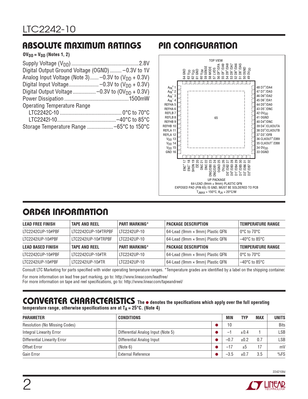 LTC2242CUP-10#PBF LTC2242CUP-10#TR LTC2242UP-10 64-Lead (9mm × 9mm) Plastic QFN 0°C to 70°C LTC2242IUP-10#PBF LTC2242IUP-10#TR LTC2242UP-10 64-Lead (9mm × 9mm) Plastic QFN –40°C to 85°C Consult LTC Marketing for parts specified with wider operating temperature ranges. *Temperature grades are identified by a label on the shipping container. For more information on lead free part marking, go to: http://www.linear.com/leadfree/ For more information on tape and reel specifications, go to: http://www.linear.com/tapeandreel/