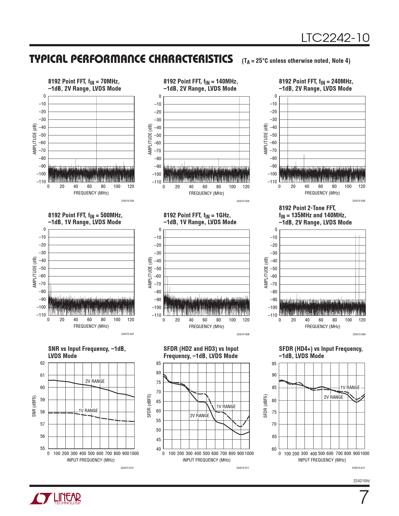 Typical perForMance characTerisTics (TA = 25°C unless otherwise noted, Note 4) 8192 Point FFT, fIN = 70MHz, 8192 Point FFT, fIN = 140MHz, 8192 Point FFT, fIN = 240MHz, –1dB, 2V Range, LVDS Mode –1dB, 2V Range, LVDS Mode –1dB, 2V Range, LVDS Mode