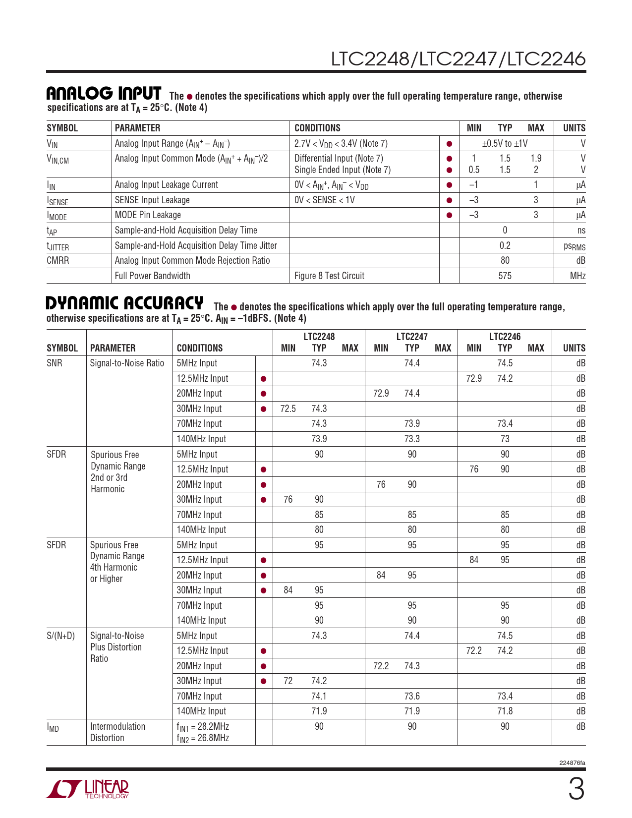 C. AIN = –1dBFS. (Note 4) LTC2248 LTC2247 LTC2246 SYMBOL PARAMETER CONDITIONS MIN TYP MAX MIN TYP MAX MIN TYP MAX UNITS