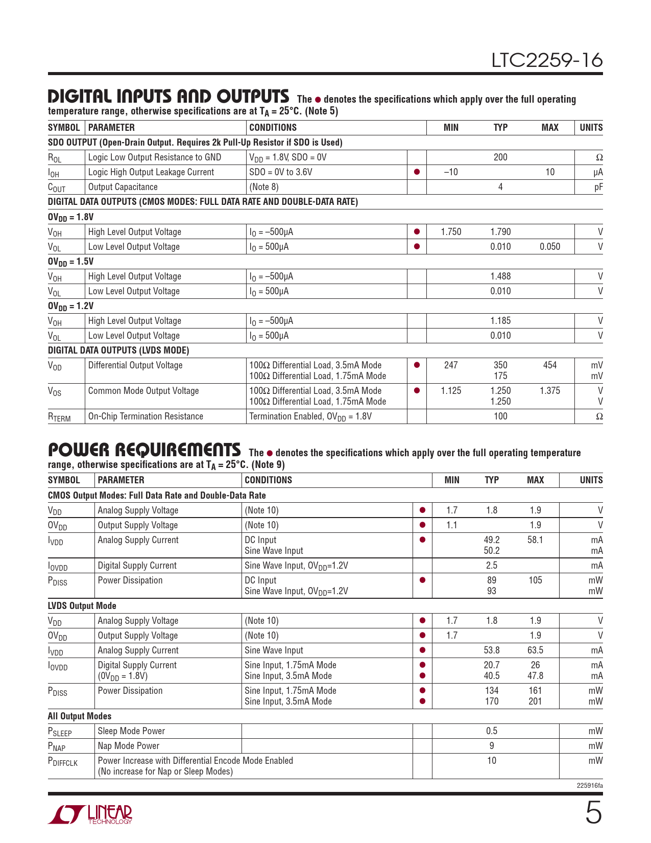 LTC2259-16 DIGITAL INPUTS AND OUTPUTSThe l denotes the specifi cations which apply over the full operatingtemperature range, otherwise specifi cations are at TA = 25°C. (Note 5)SYMBOL PARAMETERCONDITIONSMINTYPMAXUNITSSDO OUTPUT (Open-Drain Output. Requires 2k Pull-Up Resistor if SDO is Used) ROL Logic Low Output Resistance to GND VDD = 1.8V, SDO = 0V 200 Ω IOH Logic High Output Leakage Current SDO = 0V to 3.6V l –10 10 μA COUT Output Capacitance (Note 8) 4 pF DIGITAL DATA OUTPUTS (CMOS MODES: FULL DATA RATE AND DOUBLE-DATA RATE)OVDD = 1.8V VOH High Level Output Voltage IO = –500μA l 1.750 1.790 V VOL Low Level Output Voltage IO = 500μA l 0.010 0.050 V OVDD = 1.5V VOH High Level Output Voltage IO = –500μA 1.488 V VOL Low Level Output Voltage IO = 500μA 0.010 V OVDD = 1.2V VOH High Level Output Voltage IO = –500μA 1.185 V VOL Low Level Output Voltage IO = 500μA 0.010 V DIGITAL DATA OUTPUTS (LVDS MODE) VOD Differential Output Voltage 100Ω Differential Load, 3.5mA Mode l 247 350 454 mV 100Ω Differential Load, 1.75mA Mode 175 mV VOS Common Mode Output Voltage 100Ω Differential Load, 3.5mA Mode l 1.125 1.250 1.375 V 100Ω Differential Load, 1.75mA Mode 1.250 V RTERM On-Chip Termination Resistance Termination Enabled, OVDD = 1.8V 100 Ω POWER REQUIREMENTSThe l denotes the specifi cations which apply over the full operating temperaturerange, otherwise specifi cations are at TA = 25°C. (Note 9) SYMBOLPARAMETERCONDITIONSMINTYPMAXUNITSCMOS Output Modes: Full Data Rate and Double-Data Rate VDD Analog Supply Voltage (Note 10) l 1.7 1.8 1.9 V OVDD Output Supply Voltage (Note 10) l 1.1 1.9 V IVDD Analog Supply Current DC Input l 49.2 58.1 mA Sine Wave Input 50.2 mA IOVDD Digital Supply Current Sine Wave Input, OVDD=1.2V 2.5 mA PDISS Power Dissipation DC Input l 89 105 mW Sine Wave Input, OVDD=1.2V 93 mW LVDS Output Mode VDD Analog Supply Voltage (Note 10) l 1.7 1.8 1.9 V OVDD Output Supply Voltage (Note 10) l 1.7 1.9 V IVDD Analog Supply Current Sine Wave Input l 53.8 63.5 mA IOVDD Digital Supply Current Sine Input, 1.75mA Mode l 20.7 26 mA (0VDD = 1.8V) Sine Input, 3.5mA Mode l 40.5 47.8 mA PDISS Power Dissipation Sine Input, 1.75mA Mode l 134 161 mW Sine Input, 3.5mA Mode l 170 201 mW All Output Modes PSLEEP Sleep Mode Power 0.5 mW PNAP Nap Mode Power 9 mW PDIFFCLK Power Increase with Differential Encode Mode Enabled 10 mW (No increase for Nap or Sleep Modes) 225916fa 5