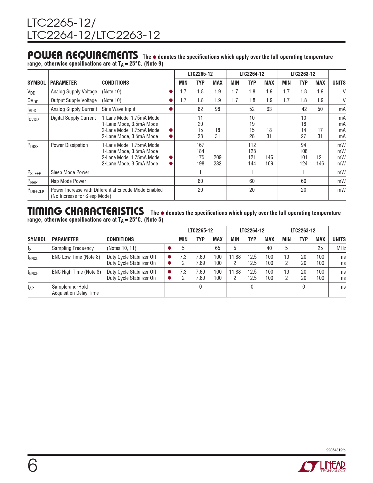 LTC2265-12/ LTC2264-12/LTC2263-12 POWER REQUIREMENTSThe l denotes the specifications which apply over the full operating temperaturerange, otherwise specifications are at TA = 25°C. (Note 9)LTC2265-12LTC2264-12LTC2263-12SYMBOL PARAMETERCONDITIONSMINTYPMAXMINTYPMAXMINTYPMAXUNITS VDD Analog Supply Voltage (Note 10) l 1.7 1.8 1.9 1.7 1.8 1.9 1.7 1.8 1.9 V OVDD Output Supply Voltage (Note 10) l 1.7 1.8 1.9 1.7 1.8 1.9 1.7 1.8 1.9 V IVDD Analog Supply Current Sine Wave Input l 82 98 52 63 42 50 mA IOVDD Digital Supply Current 1-Lane Mode, 1.75mA Mode 11 10 10 mA 1-Lane Mode, 3.5mA Mode 20 19 18 mA 2-Lane Mode, 1.75mA Mode l 15 18 15 18 14 17 mA 2-Lane Mode, 3.5mA Mode l 28 31 28 31 27 31 mA PDISS Power Dissipation 1-Lane Mode, 1.75mA Mode 167 112 94 mW 1-Lane Mode, 3.5mA Mode 184 128 108 mW 2-Lane Mode, 1.75mA Mode l 175 209 121 146 101 121 mW 2-Lane Mode, 3.5mA Mode l 198 232 144 169 124 146 mW PSLEEP Sleep Mode Power 1 1 1 mW PNAP Nap Mode Power 60 60 60 mW PDIFFCLK Power Increase with Differential Encode Mode Enabled 20 20 20 mW (No Increase for Sleep Mode) TIMING CHARACTERISTICSThe l denotes the specifications which apply over the full operating temperaturerange, otherwise specifications are at TA = 25°C. (Note 5)LTC2265-12LTC2264-12LTC2263-12SYMBOL PARAMETERCONDITIONSMINTYPMAXMINTYPMAXMINTYPMAXUNITS fS Sampling Frequency (Notes 10, 11) l 5 65 5 40 5 25 MHz tENCL ENC Low Time (Note 8) Duty Cycle Stabilizer Off l 7.3 7.69 100 11.88 12.5 100 19 20 100 ns Duty Cycle Stabilizer On l 2 7.69 100 2 12.5 100 2 20 100 ns tENCH ENC High Time (Note 8) Duty Cycle Stabilizer Off l 7.3 7.69 100 11.88 12.5 100 19 20 100 ns Duty Cycle Stabilizer On l 2 7.69 100 2 12.5 100 2 20 100 ns tAP Sample-and-Hold 0 0 0 ns Acquisition Delay Time 22654312fb 6 Document Outline Features Applications Description Typical Application Absolute Maximum Ratings Pin Configuration Order Information Converter Characteristics Analog Input Dynamic Accuracy Internal Reference Characteristics Digital Inputs And Outputs Power Requirements Timing Characteristics Timing Diagrams Typical Performance Characteristics Pin Functions Functional Block Diagram Applications Information Typical Applications Package Description Revision History Related Parts
