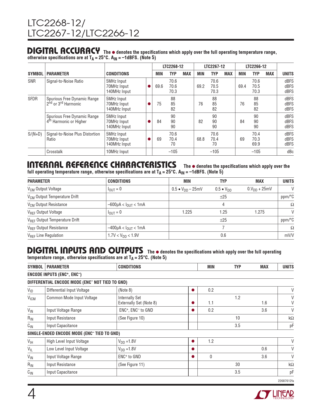 LTC2268-12/ LTC2267-12/LTC2266-12 DigiTal accuracyThe l denotes the specifications which apply over the full operating temperature range,otherwise specifications are at TA = 25°C. AIN = –1dBFS. (Note 5)LTC2268-12LTC2267-12LTC2266-12SYMBOL PARAMETERCONDITIONSMINTYPMAXMINTYPMAXMINTYPMAXUNITS SNR Signal-to-Noise Ratio 5MHz Input 70.6 70.6 70.6 dBFS 70MHz Input l 69.6 70.6 69.2 70.5 69.4 70.5 dBFS 140MHz Input 70.3 70.3 70.3 dBFS SFDR Spurious Free Dynamic Range 5MHz Input 88 88 88 dBFS 2nd or 3rd Harmonic 70MHz Input l 75 85 76 85 76 85 dBFS 140MHz Input 82 82 82 dBFS Spurious Free Dynamic Range 5MHz Input 90 90 90 dBFS 4th Harmonic or Higher 70MHz Input l 84 90 82 90 84 90 dBFS 140MHz Input 90 90 90 dBFS S/(N+D) Signal-to-Noise Plus Distortion 5MHz Input 70.6 70.6 70.4 dBFS Ratio 70MHz Input l 69 70.4 68.8 70.4 69 70.3 dBFS 140MHz Input 70 70 69.9 dBFS Crosstalk 10MHz Input –105 –105 –105 dBc inTernal reFerence characTerisTicsThe l denotes the specifications which apply over thefull operating temperature range, otherwise specifications are at TA = 25°C. AIN = –1dBFS. (Note 5) PARAMETERCONDITIONSMINTYPMAXUNITS VCM Output Voltage IOUT = 0 0.5 • VDD – 25mV 0.5 • VDD 0.VDD + 25mV V VCM Output Temperature Drift ±25 ppm/°C VCM Output Resistance –600µA < IOUT < 1mA 4 Ω VREF Output Voltage IOUT = 0 1.225 1.25 1.275 V VREF Output Temperature Drift ±25 ppm/°C VREF Output Resistance –400µA < IOUT < 1mA 7 Ω VREF Line Regulation 1.7V < VDD < 1.9V 0.6 mV/V DigiTal inpuTs anD ouTpuTsThe l denotes the specifications which apply over the full operatingtemperature range, otherwise specifications are at TA = 25°C. (Note 5) SYMBOL PARAMETERCONDITIONSMINTYPMAXUNITSENCODE INPUTS (ENC+, ENC–) DIFFERENTIAL ENCODE MODE (ENC– NOT TIED TO GND) VID Differential Input Voltage (Note 8) l 0.2 V VICM Common Mode Input Voltage Internally Set 1.2 V Externally Set (Note 8) l 1.1 1.6 V VIN Input Voltage Range ENC+, ENC– to GND l 0.2 3.6 V RIN Input Resistance (See Figure 10) 10 kΩ CIN Input Capacitance 3.5 pF SINGLE-ENDED ENCODE MODE (ENC– TIED TO GND) VIH High Level Input Voltage VDD =1.8V l 1.2 V VIL Low Level Input Voltage VDD =1.8V l 0.6 V VIN Input Voltage Range ENC+ to GND l 0 3.6 V RIN Input Resistance (See Figure 11) 30 kΩ CIN Input Capacitance 3.5 pF 22687612fa 4 Document Outline Features Description Applications Typical Application Absolute Maximum Ratings Pin Configuration Order Information Converter Characteristics Analog Input Digital Accuracy Internal Reference Characteristics Digital Inputs and Outputs Power Requirements Timing Characteristics Electrical Characteristics Timing Diagrams Typical Performance Characteristics Pin Functions Block Diagram Applications Information Typical Applications Package Description Revision History Related Parts