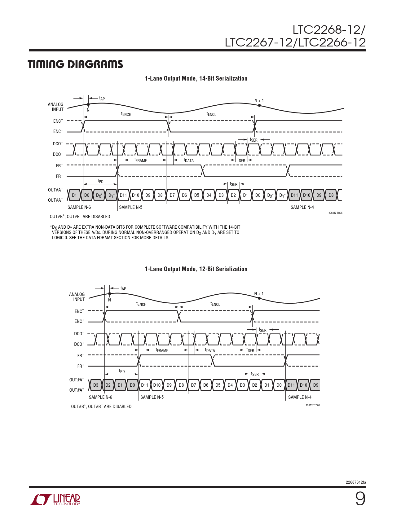 LTC2268-12/ LTC2267-12/LTC2266-12 TiMing DiagraMs1-Lane Output Mode, 14-Bit Serialization tAP N + 1 ANALOG INPUT N tENCH tENCL ENC– ENC+ tSER DCO– DCO+ tFRAME tDATA tSER FR– FR+ tPD tSER OUT#A– D1 D0 DX* DY* D11 D10 D9 D8 D7 D6 D5 D4 D3 D2 D1 D0 DX* DY* D11 D10 D9 D8 OUT#A+ SAMPLE N-6 SAMPLE N-5 SAMPLE N-4 226812 TD05 OUT#B+, OUT#B– ARE DISABLED *DX AND DY ARE EXTRA NON-DATA BITS FOR COMPLETE SOFTWARE COMPATIBILITY WITH THE 14-BIT VERSIONS OF THESE A/Ds. DURING NORMAL NON-OVERRANGED OPERATION DX AND DY ARE SET TO LOGIC 0. SEE THE DATA FORMAT SECTION FOR MORE DETAILS. 1-Lane Output Mode, 12-Bit Serialization tAP ANALOG N + 1 INPUT N tENCH tENCL ENC– ENC+ tSER DCO– DCO+ tFRAME tDATA tSER FR– FR+ tPD tSER OUT#A– D3 D2 D1 D0 D11 D10 D9 D8 D7 D6 D5 D4 D3 D2 D1 D0 D11 D10 D9 OUT#A+ SAMPLE N-6 SAMPLE N-5 SAMPLE N-4 226812 TD06 OUT#B+, OUT#B– ARE DISABLED 22687612fa 9 Document Outline Features Description Applications Typical Application Absolute Maximum Ratings Pin Configuration Order Information Converter Characteristics Analog Input Digital Accuracy Internal Reference Characteristics Digital Inputs and Outputs Power Requirements Timing Characteristics Electrical Characteristics Timing Diagrams Typical Performance Characteristics Pin Functions Block Diagram Applications Information Typical Applications Package Description Revision History Related Parts
