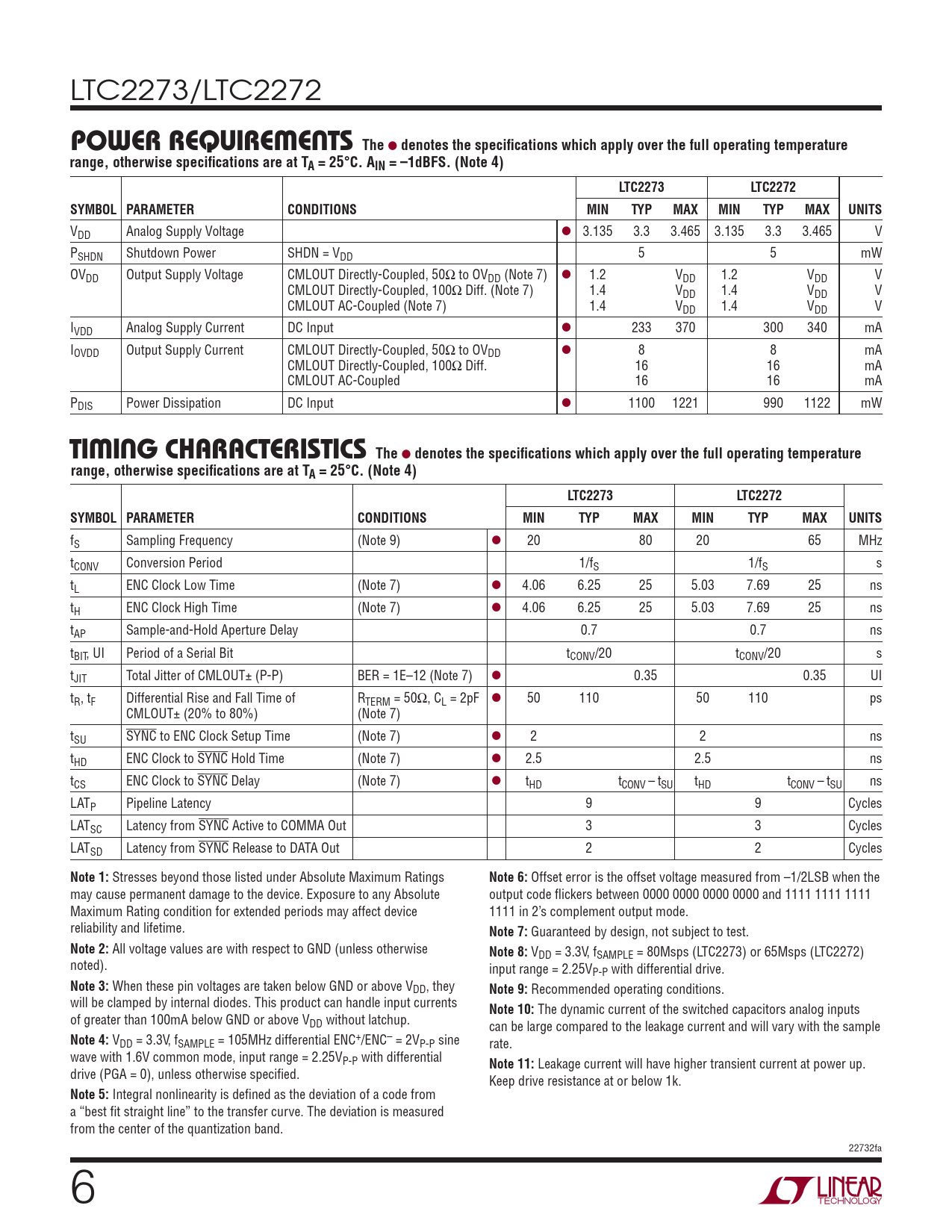 LTC2273/LTC2272 ThePOWER REQUIREMENTS l denotes the specifi cations which apply over the full operating temperaturerange, otherwise specifi cations are at TA = 25°C. AIN = –1dBFS. (Note 4)LTC2273LTC2272SYMBOL PARAMETERCONDITIONSMINTYPMAXMINTYPMAXUNITS VDD Analog Supply Voltage l 3.135 3.3 3.465 3.135 3.3 3.465 V PSHDN Shutdown Power SHDN = VDD 5 5 mW OVDD Output Supply Voltage CMLOUT Directly-Coupled, 50Ω to OVDD (Note 7) l 1.2 VDD 1.2 VDD V CMLOUT Directly-Coupled, 100Ω Diff. (Note 7) 1.4 VDD 1.4 VDD V CMLOUT AC-Coupled (Note 7) 1.4 VDD 1.4 VDD V IVDD Analog Supply Current DC Input l 233 370 300 340 mA IOVDD Output Supply Current CMLOUT Directly-Coupled, 50Ω to OVDD l 8 8 mA CMLOUT Directly-Coupled, 100Ω Diff. 16 16 mA CMLOUT AC-Coupled 16 16 mA PDIS Power Dissipation DC Input l 1100 1221 990 1122 mW TIMING CHARACTERISTICSThe l denotes the specifi cations which apply over the full operating temperaturerange, otherwise specifi cations are at TA = 25°C. (Note 4)LTC2273LTC2272SYMBOL PARAMETERCONDITIONSMINTYPMAXMINTYPMAXUNITS fS Sampling Frequency (Note 9) l 20 80 20 65 MHz tCONV Conversion Period 1/fS 1/fS s tL ENC Clock Low Time (Note 7) l 4.06 6.25 25 5.03 7.69 25 ns tH ENC Clock High Time (Note 7) l 4.06 6.25 25 5.03 7.69 25 ns tAP Sample-and-Hold Aperture Delay 0.7 0.7 ns tBIT, UI Period of a Serial Bit tCONV/20 tCONV/20 s tJIT Total Jitter of CMLOUT± (P-P) BER = 1E–12 (Note 7) l 0.35 0.35 UI tR, tF Differential Rise and Fall Time of RTERM = 50Ω, CL = 2pF l 50 110 50 110 ps CMLOUT± (20% to 80%) (Note 7) tSU SYNC to ENC Clock Setup Time (Note 7) l 2 2 ns tHD ENC Clock to SYNC Hold Time (Note 7) l 2.5 2.5 ns tCS ENC Clock to SYNC Delay (Note 7) l tHD tCONV – tSU tHD tCONV – tSU ns LATP Pipeline Latency 9 9 Cycles LATSC Latency from SYNC Active to COMMA Out 3 3 Cycles LATSD Latency from SYNC Release to DATA Out 2 2 Cycles Note 1: Stresses beyond those listed under Absolute Maximum Ratings Note 6: Offset error is the offset voltage measured from –1/2LSB when the may cause permanent damage to the device. Exposure to any Absolute output code fl ickers between 0000 0000 0000 0000 and 1111 1111 1111 Maximum Rating condition for extended periods may affect device 1111 in 2’s complement output mode. reliability and lifetime. Note 7: Guaranteed by design, not subject to test. Note 2: All voltage values are with respect to GND (unless otherwise Note 8: VDD = 3.3V, fSAMPLE = 80Msps (LTC2273) or 65Msps (LTC2272) noted). input range = 2.25VP-P with differential drive. Note 3: When these pin voltages are taken below GND or above VDD, they Note 9: Recommended operating conditions. will be clamped by internal diodes. This product can handle input currents Note 10: The dynamic current of the switched capacitors analog inputs of greater than 100mA below GND or above VDD without latchup. can be large compared to the leakage current and will vary with the sample Note 4: VDD = 3.3V, fSAMPLE = 105MHz differential ENC+/ENC– = 2VP-P sine rate. wave with 1.6V common mode, input range = 2.25VP-P with differential Note 11: Leakage current will have higher transient current at power up. drive (PGA = 0), unless otherwise specifi ed. Keep drive resistance at or below 1k. Note 5: Integral nonlinearity is defi ned as the deviation of a code from a “best fi t straight line” to the transfer curve. The deviation is measured from the center of the quantization band. 22732fa 6