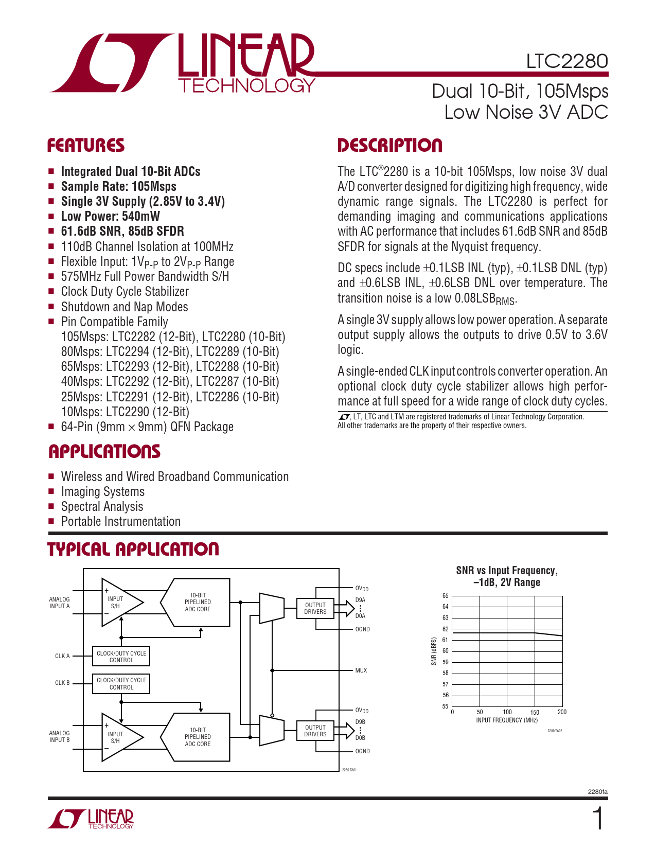 LTC2280 Dual 10-Bit, 105Msps Low Noise 3V ADC