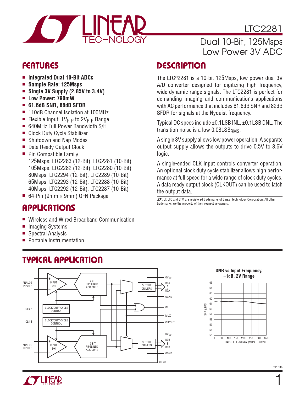 The LTC®2281 is a 10-bit 125Msps, low power dual 3V n