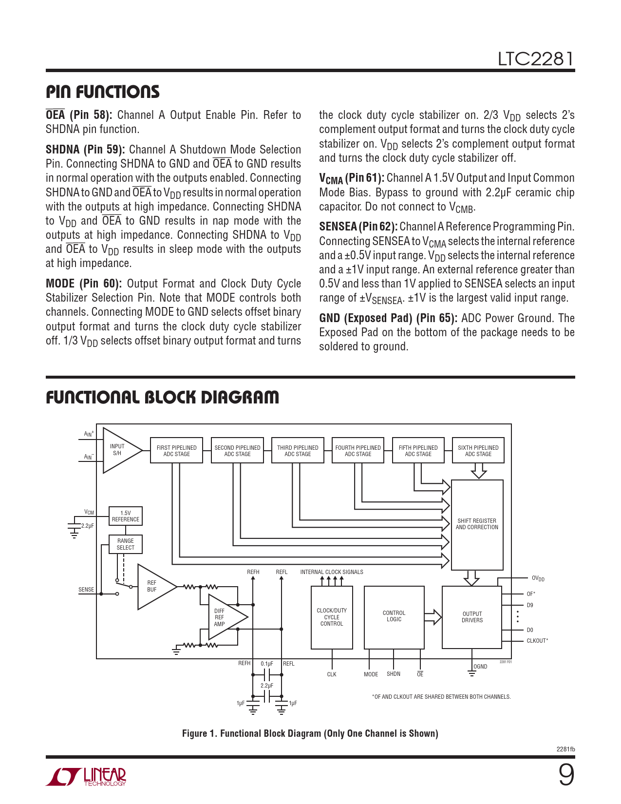 A + IN INPUT FIRST PIPELINED SECOND PIPELINED THIRD PIPELINED FOURTH PIPELINED FIFTH PIPELINED SIXTH PIPELINED – S/H ADC STAGE ADC STAGE ADC STAGE ADC STAGE ADC STAGE ADC STAGE AIN VCM 1.5V REFERENCE SHIFT REGISTER 2.2μF AND CORRECTION RANGE SELECT REFH REFL INTERNAL CLOCK SIGNALS OVDD REF SENSE BUF OF* D9 DIFF CLOCK/DUTY CONTROL OUTPUT • REF CYCLE LOGIC • DRIVERS AMP CONTROL • D0 CLKOUT* REFH 0.1μF REFL 2281 F01 OGND CLK MODE SHDN OE 2.2μF *OF AND CLKOUT ARE SHARED BETWEEN BOTH CHANNELS. 1μF 1μF