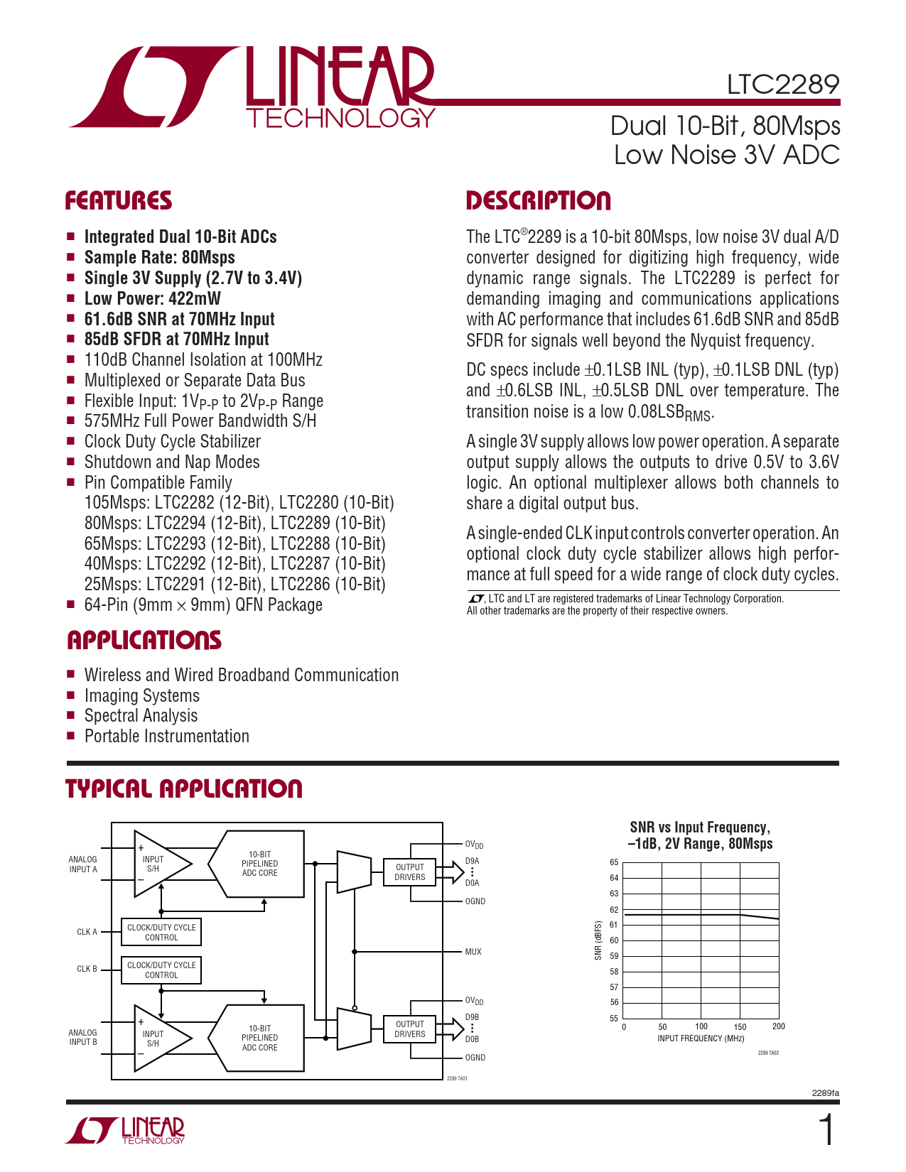 The LTC®2289 is a 10-bit 80Msps, low noise 3V dual A/D ■