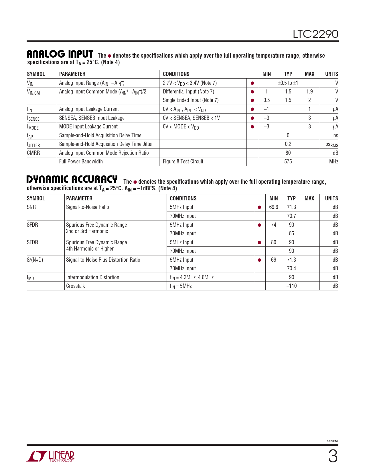 SNR Signal-to-Noise Ratio 5MHz Input ● 69.6 71.3 dB 70MHz Input 70.7 dB SFDR Spurious Free Dynamic Range 5MHz Input ● 74 90 dB 2nd or 3rd Harmonic 70MHz Input 85 dB SFDR Spurious Free Dynamic Range 5MHz Input ● 80 90 dB 4th Harmonic or Higher 70MHz Input 90 dB S/(N+D) Signal-to-Noise Plus Distortion Ratio 5MHz Input ● 69 71.3 dB 70MHz Input 70.4 dB IMD Intermodulation Distortion fIN = 4.3MHz, 4.6MHz 90 dB Crosstalk fIN = 5MHz –110 dB 2290fa 3