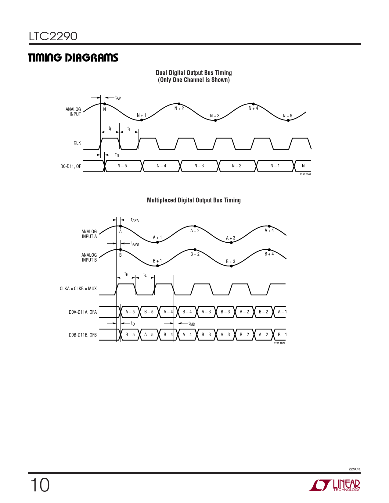 LTC2290 WUWTI I G DIAGRA SDual Digital Output Bus Timing(Only One Channel is Shown) tAP N + 2 N + 4 ANALOG N INPUT N + 1 N + 3 N + 5 tH tL CLK tD D0-D11, OF N – 5 N – 4 N – 3 N – 2 N – 1 N 2290 TD01 Multiplexed Digital Output Bus Timing tAPA A + 2 A + 4 ANALOG A INPUT A A + 1 A + 3 tAPB B + 2 B + 4 ANALOG B INPUT B B + 1 B + 3 tH tL CLKA = CLKB = MUX D0A-D11A, OFA A – 5 B – 5 A – 4 B – 4 A – 3 B – 3 A – 2 B – 2 A – 1 tD tMD D0B-D11B, OFB B – 5 A – 5 B – 4 A – 4 B – 3 A – 3 B – 2 A – 2 B – 1 2290 TD02 2290fa 10