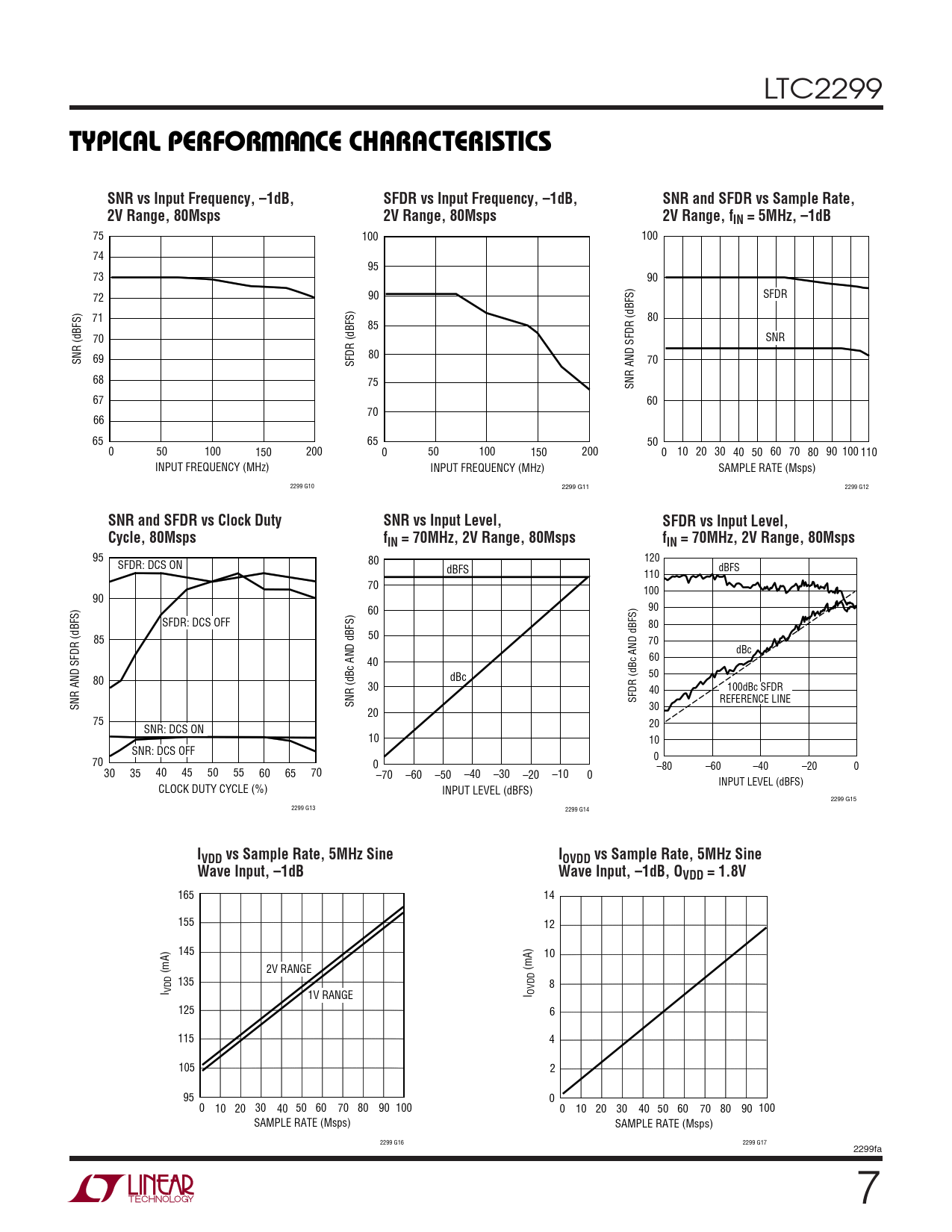 75 100 100 74 95 73 90 72 90 SFDR 71 80 85 70 SNR 80 SNR (dBFS) 69 SFDR (dBFS) 70 68 75 SNR AND SFDR (dBFS) 67 60 70 66 65 65 50 0 50 100 150 200 0 50 100 150 200 0 10 20 30 40 50 60 70 80 90 100 110 INPUT FREQUENCY (MHz) INPUT FREQUENCY (MHz) SAMPLE RATE (Msps) 2299 G10 2299 G11 2299 G12