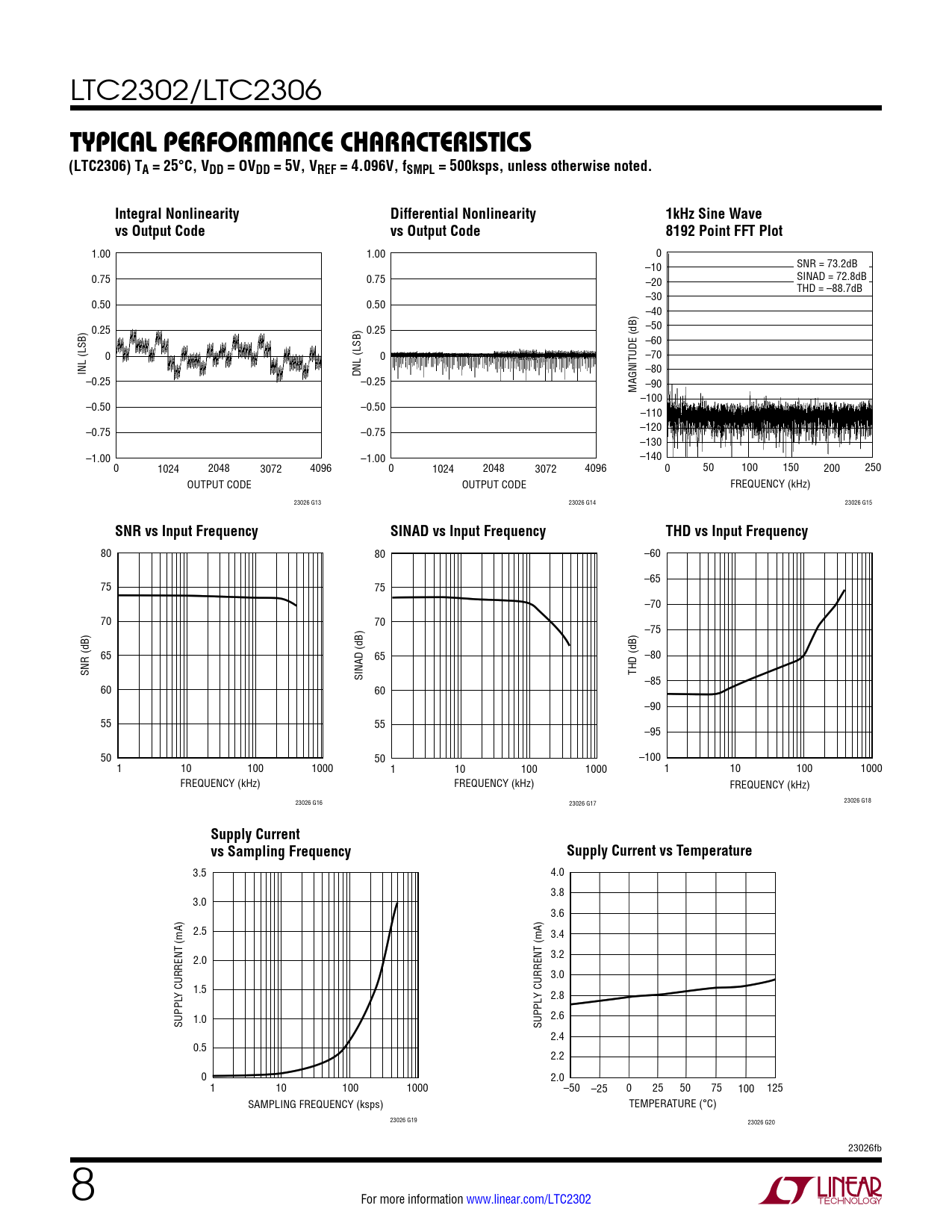 80 80 –60 –65 75 75 –70 70 70 –75 65 65 –80 SNR (dB) SINAD (dB) THD (dB) –85 60 60 –90 55 55 –95 50 50 –100 1 10 100 1000 1 10 100 1000 1 10 100 1000 FREQUENCY (kHz) FREQUENCY (kHz) FREQUENCY (kHz) 23026 G16 23026 G17 23026 G18