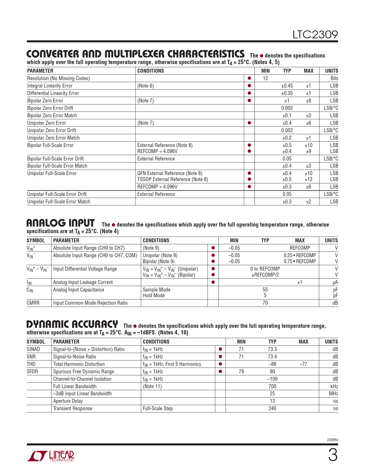 LTC2309 C OnVeRteR AnD MuLtIpLexeR CHARACteRIstICs The l denotes the specificationswhich apply over the full operating temperature range, otherwise specifications are at TA = 25°C. (Notes 4, 5)PARAMETERCONDITIONSMINTYPMAXUNITS Resolution (No Missing Codes) l 12 Bits Integral Linearity Error (Note 6) l ±0.45 ±1 LSB Differential Linearity Error l ±0.35 ±1 LSB Bipolar Zero Error (Note 7) l ±1 ±8 LSB Bipolar Zero Error Drift 0.002 LSB/°C Bipolar Zero Error Match ±0.1 ±3 LSB Unipolar Zero Error (Note 7) l ±0.4 ±6 LSB Unipolar Zero Error Drift 0.002 LSB/°C Unipolar Zero Error Match ±0.2 ±1 LSB Bipolar Full-Scale Error External Reference (Note 8) l ±0.5 ±10 LSB REFCOMP = 4.096V l ±0.4 ±9 LSB Bipolar Full-Scale Error Drift External Reference 0.05 LSB/°C Bipolar Full-Scale Error Match ±0.4 ±3 LSB Unipolar Full-Scale Error QFN External Reference (Note 8) l ±0.4 ±10 LSB TSSOP External Reference (Note 8) l ±0.5 ±12 LSB REFCOMP = 4.096V l ±0.3 ±6 LSB Unipolar Full-Scale Error Drift External Reference 0.05 LSB/°C Unipolar Full-Scale Error Match ±0.3 ±2 LSB A nALOG Input The l denotes the specifications which apply over the full operating temperature range, otherwisespecifications are at TA = 25°C. (Note 4) SYMBOLPARAMETERCONDITIONSMINTYPMAXUNITS V + IN Absolute Input Range (CH0 to CH7) (Note 9) l –0.05 REFCOMP V V – IN Absolute Input Range (CH0 to CH7, COM) Unipolar (Note 9) l –0.05 0.25 • REFCOMP V Bipolar (Note 9) l –0.05 0.75 • REFCOMP V V + – + – IN – VIN Input Differential Voltage Range VIN = VIN – VIN (Unipolar) l 0 to REFCOMP V V + – IN = VIN – VIN (Bipolar) l ±REFCOMP/2 V IIN Analog Input Leakage Current l ±1 µA CIN Analog Input Capacitance Sample Mode 55 pF Hold Mode 5 pF CMRR Input Common Mode Rejection Ratio 70 dB D YnAMIC ACCuRACY The l denotes the specifications which apply over the full operating temperature range,otherwise specifications are at TA = 25°C. AIN = –1dBFS. (Notes 4, 10) SYMBOLPARAMETERCONDITIONSMINTYPMAXUNITS SINAD Signal-to-(Noise + Distortion) Ratio fIN = 1kHz l 71 73.3 dB SNR Signal-to-Noise Ratio fIN = 1kHz l 71 73.4 dB THD Total Harmonic Distortion fIN = 1kHz, First 5 Harmonics l –88 –77 dB SFDR Spurious Free Dynamic Range fIN = 1kHz l 79 90 dB Channel-to-Channel Isolation fIN = 1kHz –109 dB Full Linear Bandwidth (Note 11) 700 kHz –3dB Input Linear Bandwidth 25 MHz Aperture Delay 13 ns Transient Response Full-Scale Step 240 ns 2309fd Document Outline Features Description Applications Absolute Maximum Ratings Pin Configuration Order Information CONVERTER AND MULTIPLEXER CHARACTERISTICS ANALOG INPUT DYNAMIC ACCURACY INTERNAL REFERENCE CHARACTERISTICS I2C Inputs and Digital Outputs POWER REQUIREMENTS I2C TIMING CHARACTERISTICS ADC TIMING CHARACTERISTICS Typical Performance Characteristics Pin Functions Functional Block Diagram TIMING DIAGRAM Applications Information Package Description Revision History Typical Application Related Parts
