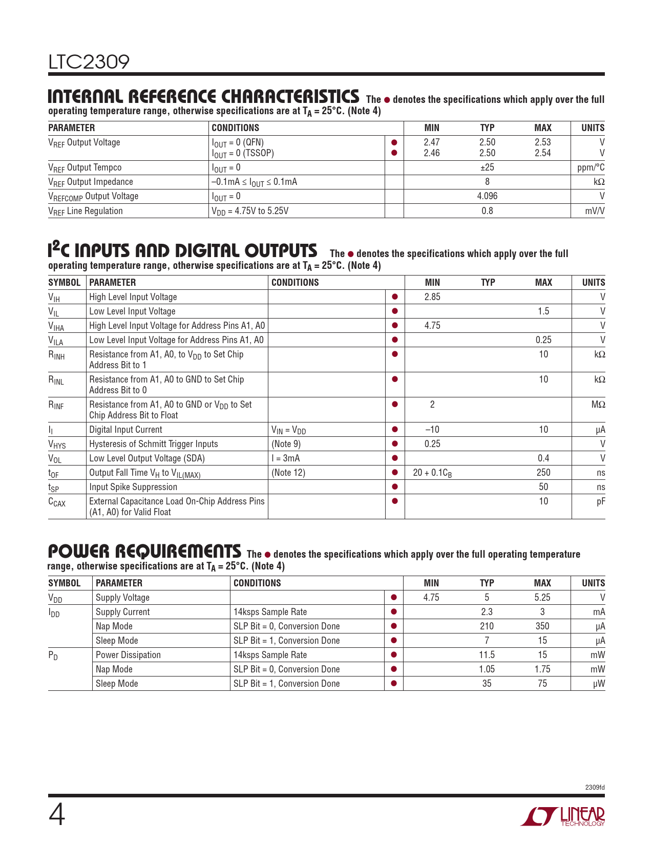 VREF Output Voltage IOUT = 0 (QFN) l 2.47 2.50 2.53 V IOUT = 0 (TSSOP) l 2.46 2.50 2.54 V VREF Output Tempco IOUT = 0 ±25 ppm/°C VREF Output Impedance –0.1mA ≤ IOUT ≤ 0.1mA 8 kΩ VREFCOMP Output Voltage IOUT = 0 4.096 V VREF Line Regulation VDD = 4.75V to 5.25V 0.8 mV/V I2 C Inputs AnD DIGItAL Outputs