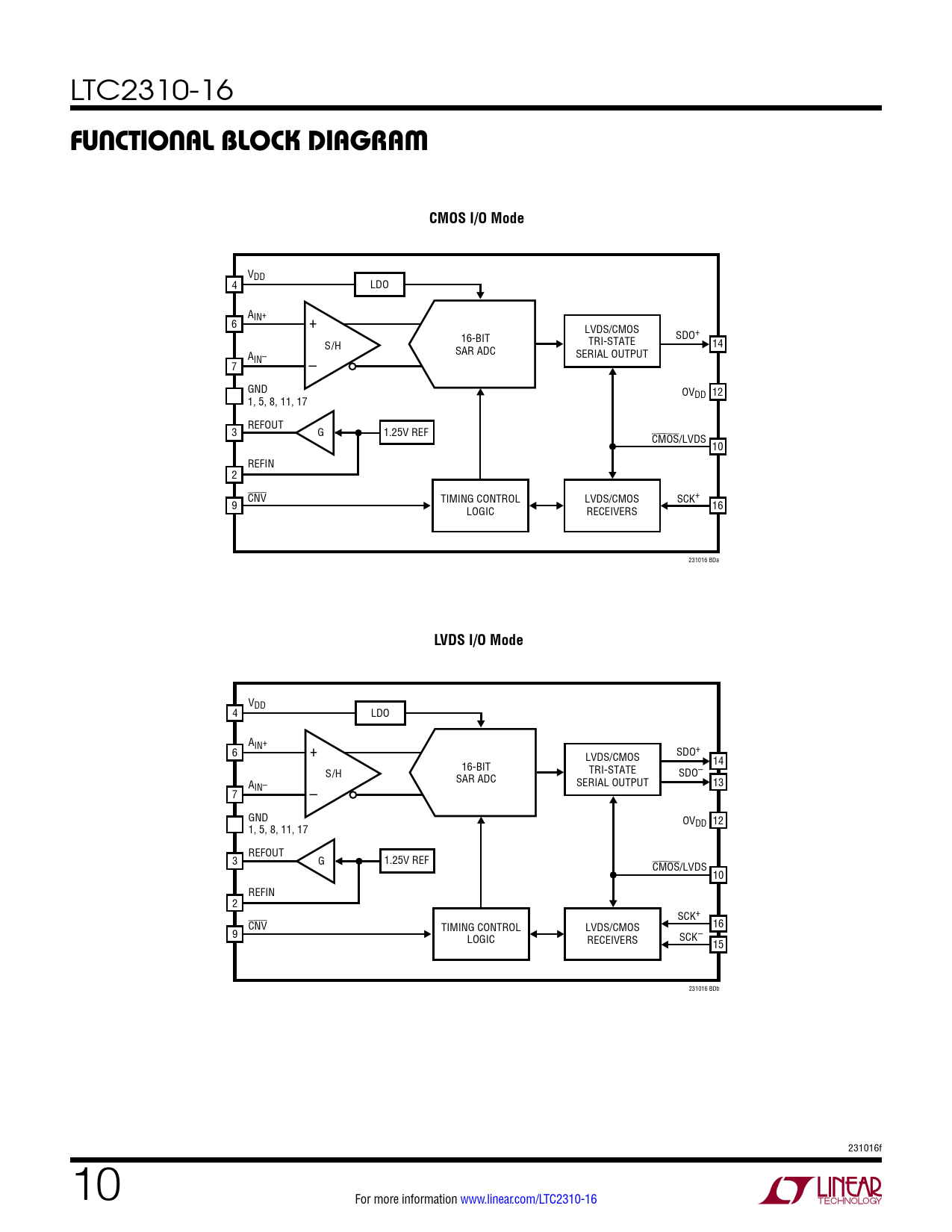 VDD 4 LDO AIN+ 6 + LVDS/CMOS 16-BIT TRI-STATE SDO+ S/H 14 SAR ADC A SERIAL OUTPUT IN– 7 – GND OVDD 12 1, 5, 8, 11, 17 REFOUT 3 G 1.25V REF CMOS/LVDS 10 REFIN 2 CNV TIMING CONTROL LVDS/CMOS SCK+ 9 LOGIC RECEIVERS 16 231016 BDa