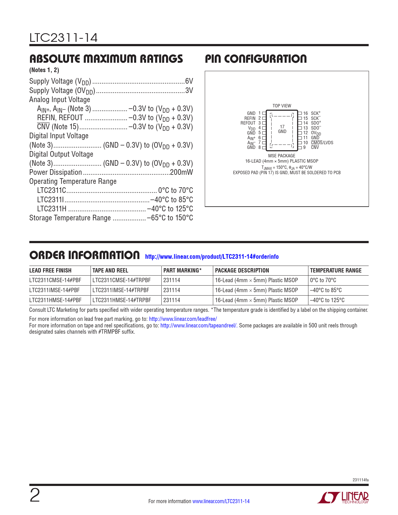 LTC2311-14 ABSOLUTE MAXIMUM RATINGSPIN CONFIGURATION(Notes 1, 2) Supply Voltage (VDD) ..6V Supply Voltage (OVDD) ..3V Analog Input Voltage A TOP VIEW IN+, AIN– (Note 3) ... –0.3V to (VDD + 0.3V) REFIN, REFOUT ... –0.3V to (V GND 1 16 SCK+ DD + 0.3V) REFIN 2 15 SCK– CNV (Note 15) .. –0.3V to (V REFOUT 3 14 SDO+ DD + 0.3V) V 4 17 DD 13 SDO– Digital Input Voltage GND 5 GND 12 OVDD A 6 IN+ 11 GND (Note 3) .. (GND – 0.3V) to (OV A 7 10 CMOS/LVDS DD + 0.3V) IN– GND 8 9 CNV Digital Output Voltage MSE PACKAGE (Note 3) .. (GND – 0.3V) to (OV 16-LEAD (4mm × 5mm) PLASTIC MSOP DD + 0.3V) Power Dissipation ...200mW TJMAX = 150°C, θJA = 40°C/W EXPOSED PAD (PIN 17) IS GND, MUST BE SOLDERED TO PCB Operating Temperature Range LTC2311C ... 0°C to 70°C LTC2311I ..–40°C to 85°C LTC2311H .. –40°C to 125°C Storage Temperature Range .. –65°C to 150°C ORDER INFORMATION http://www.linear.com/product/LTC2311-14#orderinfoLEAD FREE FINISHTAPE AND REELPART MARKING*PACKAGE DESCRIPTIONTEMPERATURE RANGE LTC2311CMSE-14#PBF LTC2311CMSE-14#TRPBF 231114 16-Lead (4mm × 5mm) Plastic MSOP 0°C to 70°C LTC2311IMSE-14#PBF LTC2311IMSE-14#TRPBF 231114 16-Lead (4mm × 5mm) Plastic MSOP –40°C to 85°C LTC2311HMSE-14#PBF LTC2311HMSE-14#TRPBF 231114 16-Lead (4mm × 5mm) Plastic MSOP –40°C to 125°C Consult LTC Marketing for parts specified with wider operating temperature ranges. *The temperature grade is identified by a label on the shipping container. For more information on lead free part marking, go to: http://www.linear.com/leadfree/ For more information on tape and reel specifications, go to: http://www.linear.com/tapeandreel/. Some packages are available in 500 unit reels through designated sales channels with #TRMPBF suffix. 231114fa 2 For more information www.linear.com/LTC2311-14 Document Outline Features Applications Description Typical Application Absolute Maximum Ratings Pin Configuration Electrical Characteristics Converter Characteristics Dynamic Accuracy Internal Reference Characteristics Digital Inputs And Digital Outputs Power Requirements ADC Timing Characteristics Typical Performance Characteristics Functional Block Diagram Timing Diagram Applications Information Package Description Related Parts Features Applications Typical Application Description Absolute Maximum Ratings Order Information Pin Configuration Electrical Characteristics Converter Characteristics Dynamic Accuracy Internal Reference Characteristics Digital Inputs And Digital Outputs Power Requirements ADC Timing Characteristics Typical Performance Characteristics Pin Functions Functional Block Diagram Timing Diagram Applications Information OVERVIEW CONVERTER OPERATION TRANSFER FUNCTION INPUT DRIVE CIRCUITS ADC REFERENCE DYNAMIC PERFORMANCE POWER CONSIDERATIONS TIMING AND CONTROL DIGITAL INTERFACE BOARD LAYOUT Package Description Revision History Typical Application Related Parts