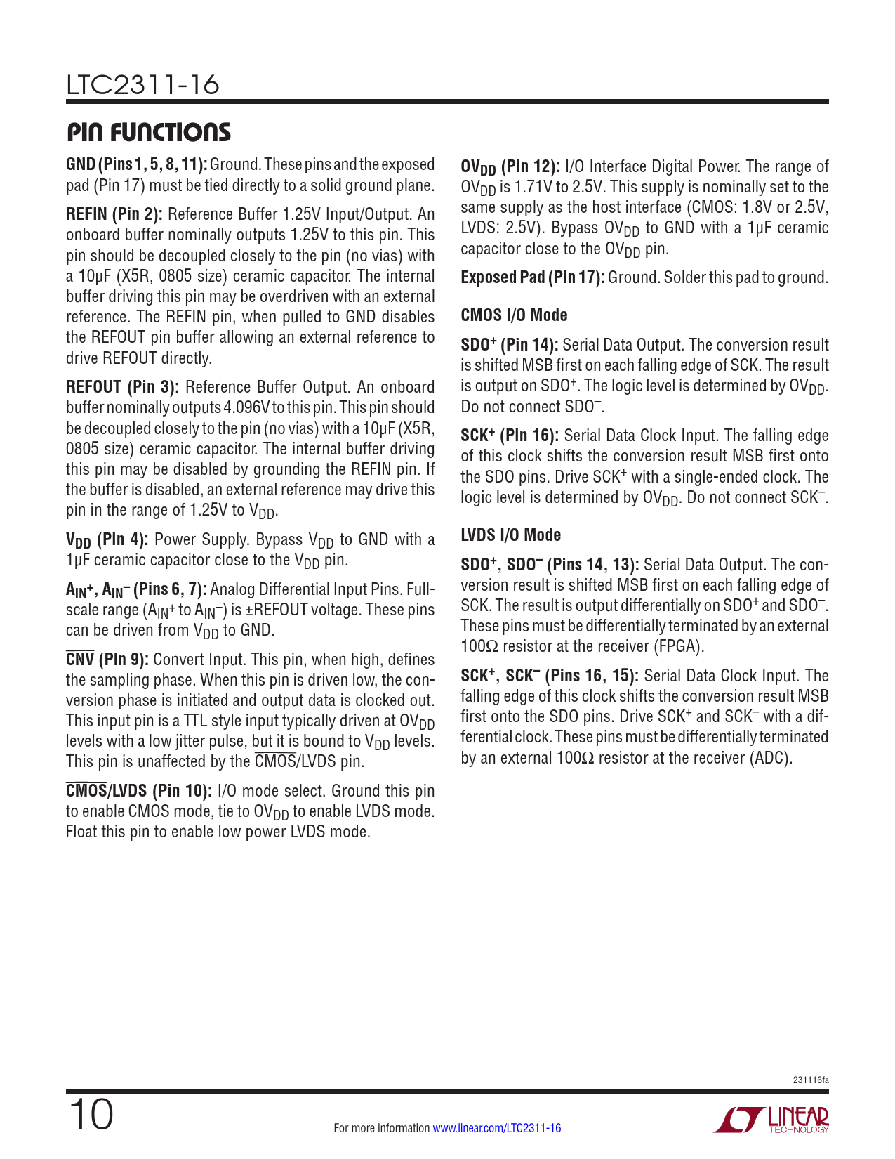 LTC2311-16 PIN FUNCTIONSGND (Pins 1, 5, 8, 11): Ground. These pins and the exposed OVDD (Pin 12): I/O Interface Digital Power. The range of pad (Pin 17) must be tied directly to a solid ground plane. OVDD is 1.71V to 2.5V. This supply is nominally set to the REFIN (Pin 2): Reference Buffer 1.25V Input/Output. An same supply as the host interface (CMOS: 1.8V or 2.5V, onboard buffer nominally outputs 1.25V to this pin. This LVDS: 2.5V). Bypass OVDD to GND with a 1μF ceramic pin should be decoupled closely to the pin (no vias) with capacitor close to the OVDD pin. a 10μF (X5R, 0805 size) ceramic capacitor. The internal Exposed Pad (Pin 17): Ground. Solder this pad to ground. buffer driving this pin may be overdriven with an external reference. The REFIN pin, when pulled to GND disables CMOS I/O Mode the REFOUT pin buffer allowing an external reference to SDO+ (Pin 14): Serial Data Output. The conversion result drive REFOUT directly. is shifted MSB first on each falling edge of SCK. The result REFOUT (Pin 3): Reference Buffer Output. An onboard is output on SDO+. The logic level is determined by OVDD. buffer nominally outputs 4.096V to this pin. This pin should Do not connect SDO–. be decoupled closely to the pin (no vias) with a 10μF (X5R, SCK+ (Pin 16): Serial Data Clock Input. The falling edge 0805 size) ceramic capacitor. The internal buffer driving of this clock shifts the conversion result MSB first onto this pin may be disabled by grounding the REFIN pin. If the SDO pins. Drive SCK+ with a single-ended clock. The the buffer is disabled, an external reference may drive this logic level is determined by OV pin in the range of 1.25V to V DD. Do not connect SCK–. DD. VLVDS I/O ModeDD (Pin 4): Power Supply. Bypass VDD to GND with a 1µF ceramic capacitor close to the VDD pin. SDO+, SDO– (Pins 14, 13): Serial Data Output. The con- A version result is shifted MSB first on each falling edge of IN+, AIN– (Pins 6, 7): Analog Differential Input Pins. Full- scale range (A SCK. The result is output differentially on SDO+ and SDO–. IN+ to AIN–) is ±REFOUT voltage. These pins can be driven from V These pins must be differentially terminated by an external DD to GND. 100Ω resistor at the receiver (FPGA). CNV (Pin 9): Convert Input. This pin, when high, defines the sampling phase. When this pin is driven low, the con- SCK+, SCK– (Pins 16, 15): Serial Data Clock Input. The version phase is initiated and output data is clocked out. falling edge of this clock shifts the conversion result MSB This input pin is a TTL style input typically driven at OV first onto the SDO pins. Drive SCK+ and SCK– with a dif- DD levels with a low jitter pulse, but it is bound to V ferential clock. These pins must be differentially terminated DD levels. This pin is unaffected by the CMOS/LVDS pin. by an external 100Ω resistor at the receiver (ADC). CMOS/LVDS (Pin 10): I/O mode select. Ground this pin to enable CMOS mode, tie to OVDD to enable LVDS mode. Float this pin to enable low power LVDS mode. 231116fa 10 For more information www.linear.com/LTC2311-16 Document Outline Features Applications Description Typical Application Absolute Maximum Ratings Pin Configuration Electrical Characteristics Converter Characteristics Dynamic Accuracy Internal Reference Characteristics Digital Inputs And Digital Outputs Power Requirements ADC Timing Characteristics Typical Performance Characteristics Functional Block Diagram Timing Diagram Applications Information Package Description Related Parts Features Applications Typical Application Description Absolute Maximum Ratings Order Information Pin Configuration Converter Characteristics Electrical Characteristics Dynamic Accuracy Internal Reference Characteristics Digital Inputs And Digital Outputs Power Requirements ADC Timing Characteristics Typical Performance Characteristics Pin Functions Functional Block Diagram Timing Diagram Applications Information OVERVIEW CONVERTER OPERATION TRANSFER FUNCTION INPUT DRIVE CIRCUITS ADC REFERENCE DYNAMIC PERFORMANCE POWER CONSIDERATIONS TIMING AND CONTROL DIGITAL INTERFACE BOARD LAYOUT Package Description Revision History Typical Application Related Parts