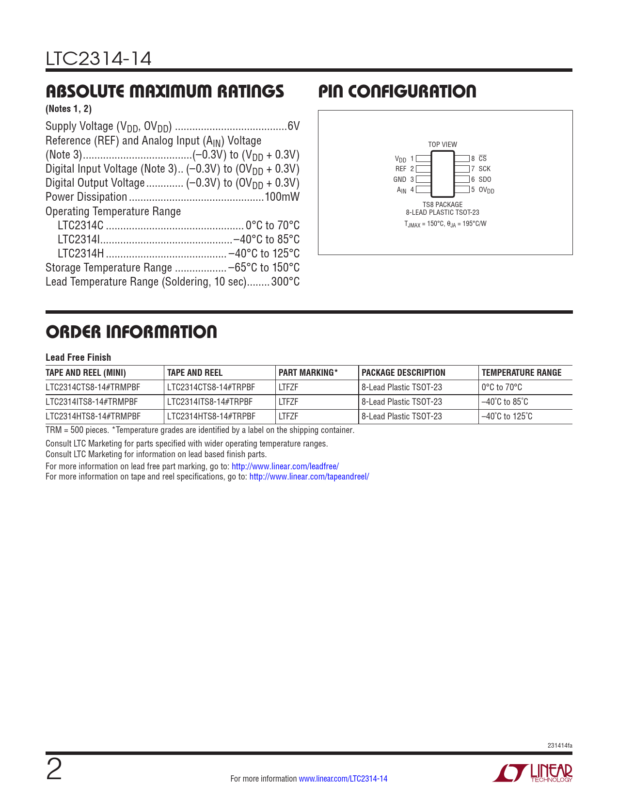 LTC2314CTS8-14#TRMPBF LTC2314CTS8-14#TRPBF LTFZF 8-Lead Plastic TSOT-23 0°C to 70°C LTC2314ITS8-14#TRMPBF LTC2314ITS8-14#TRPBF LTFZF 8-Lead Plastic TSOT-23 –40˚C to 85˚C LTC2314HTS8-14#TRMPBF LTC2314HTS8-14#TRPBF LTFZF 8-Lead Plastic TSOT-23 –40˚C to 125˚C TRM = 500 pieces. *Temperature grades are identified by a label on the shipping container. Consult LTC Marketing for parts specified with wider operating temperature ranges. Consult LTC Marketing for information on lead based finish parts. For more information on lead free part marking, go to: http://www.linear.com/leadfree/ For more information on tape and reel specifications, go to: http://www.linear.com/tapeandreel/ 231414fa 2 For more information www.linear.com/LTC2314-14