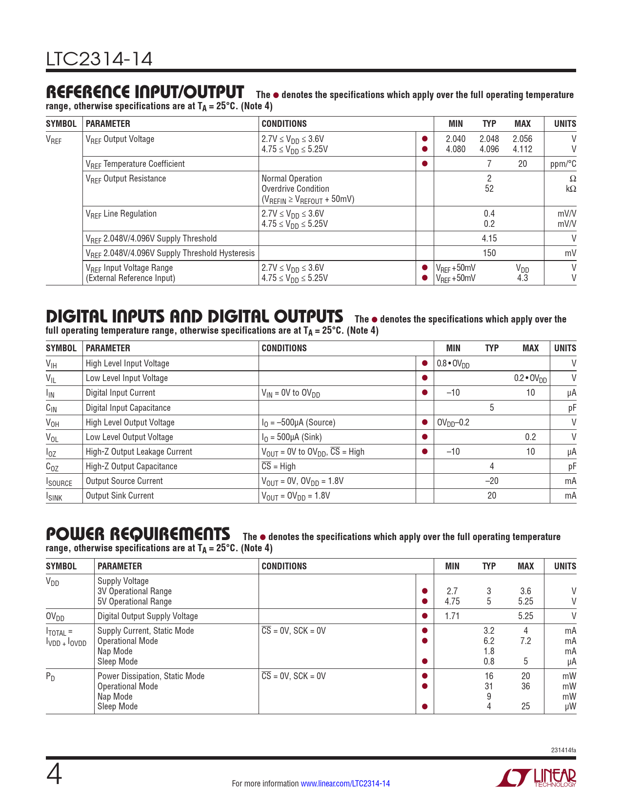 LTC2314-14 REFERENCEINPUT/OUTPUT The l denotes the specifications which apply over the full operating temperaturerange, otherwise specifications are at TA = 25°C. (Note 4) SYMBOL PARAMETERCONDITIONSMINTYPMAXUNITS VREF VREF Output Voltage 2.7V ≤ VDD ≤ 3.6V l 2.040 2.048 2.056 V 4.75 ≤ VDD ≤ 5.25V l 4.080 4.096 4.112 V VREF Temperature Coefficient l 7 20 ppm/°C VREF Output Resistance Normal Operation 2 Ω Overdrive Condition 52 kΩ (VREFIN ≥ VREFOUT + 50mV) VREF Line Regulation 2.7V ≤ VDD ≤ 3.6V 0.4 mV/V 4.75 ≤ VDD ≤ 5.25V 0.2 mV/V VREF 2.048V/4.096V Supply Threshold 4.15 V VREF 2.048V/4.096V Supply Threshold Hysteresis 150 mV VREF Input Voltage Range 2.7V ≤ VDD ≤ 3.6V l VREF + 50mV VDD V (External Reference Input) 4.75 ≤ VDD ≤ 5.25V l VREF + 50mV 4.3 V DIGITALINPUTS AND DIGITAL OUTPUTS The l denotes the specifications which apply over thefull operating temperature range, otherwise specifications are at TA = 25°C. (Note 4) SYMBOL PARAMETERCONDITIONSMINTYPMAXUNITS VIH High Level Input Voltage l 0.8 • OVDD V VIL Low Level Input Voltage l 0.2 • OVDD V IIN Digital Input Current VIN = 0V to OVDD l –10 10 μA CIN Digital Input Capacitance 5 pF VOH High Level Output Voltage IO = –500µA (Source) l OVDD–0.2 V VOL Low Level Output Voltage IO = 500µA (Sink) l 0.2 V IOZ High-Z Output Leakage Current VOUT = 0V to OVDD, CS = High l –10 10 µA COZ High-Z Output Capacitance CS = High 4 pF ISOURCE Output Source Current VOUT = 0V, OVDD = 1.8V –20 mA ISINK Output Sink Current VOUT = OVDD = 1.8V 20 mA POWERREQUIREMENTS The l denotes the specifications which apply over the full operating temperaturerange, otherwise specifications are at TA = 25°C. (Note 4) SYMBOLPARAMETERCONDITIONSMINTYPMAXUNITS VDD Supply Voltage 3V Operational Range l 2.7 3 3.6 V 5V Operational Range l 4.75 5 5.25 V OVDD Digital Output Supply Voltage l 1.71 5.25 V ITOTAL = Supply Current, Static Mode CS = 0V, SCK = 0V l 3.2 4 mA IVDD + IOVDD Operational Mode l 6.2 7.2 mA Nap Mode 1.8 mA Sleep Mode l 0.8 5 µA PD Power Dissipation, Static Mode CS = 0V, SCK = 0V l 16 20 mW Operational Mode l 31 36 mW Nap Mode 9 mW Sleep Mode l 4 25 µW 231414fa 4 For more information www.linear.com/LTC2314-14