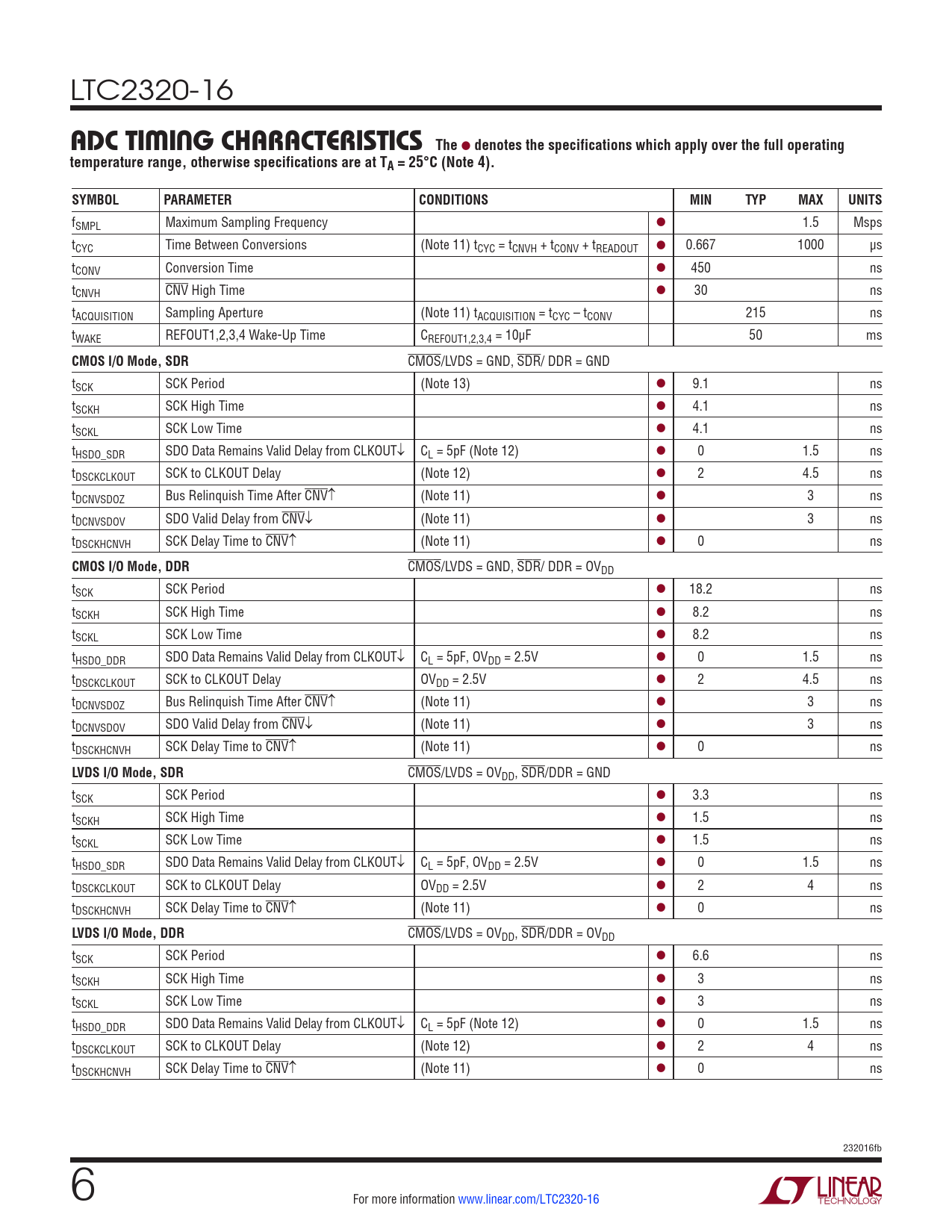 CMOS/LVDS = OVDD, SDR/DDR = OVDD tSCK SCK Period l 6.6 ns tSCKH SCK High Time l 3 ns tSCKL SCK Low Time l 3 ns tHSDO_DDR SDO Data Remains Valid Delay from CLKOUT↓ CL = 5pF (Note 12) l 0 1.5 ns tDSCKCLKOUT SCK to CLKOUT Delay (Note 12) l 2 4 ns tDSCKHCNVH SCK Delay Time to CNV↑ (Note 11) l 0 ns 232016fb 6 For more information www.linear.com/LTC2320-16 Document Outline Features Applications Description Typical Application Absolute Maximum Ratings Pin Configuration Order Information Electrical Characteristics Converter Characteristics Dynamic Accuracy Internal Reference Characteristics Digital Inputs And Digital Outputs Power Requirements ADC Timing Characteristics Typical Performance Characteristics Pin Functions Functional Block Diagram Timing Diagram Applications Information Package Description Related Parts .32673 Applications Typical Application Description Absolute Maximum Ratings Order Information Pin Configuration Electrical Characteristics Converter Characteristics Digital Inputs And Digital Outputs Power Requirements ADC Timing Characteristics ADC Timing Characteristics ADC Timing Characteristics Typical Performance Characteristics Pin Functions CMOS data output option (CMOS/LVDS = low) LVDS data output option (CMOS/LVDS = high or FLOAT) Functional Block Diagram Timing Diagram Applications Information OVERVIEW CONVERTER OPERATION TRANSFER FUNCTION INPUT DRIVE CIRCUITS ADC REFERENCE DYNAMIC PERFORMANCE POWER CONSIDERATIONS TIMING AND CONTROL DIGITAL INTERFACE BOARD LAYOUT Package Description Typical Application Related Parts