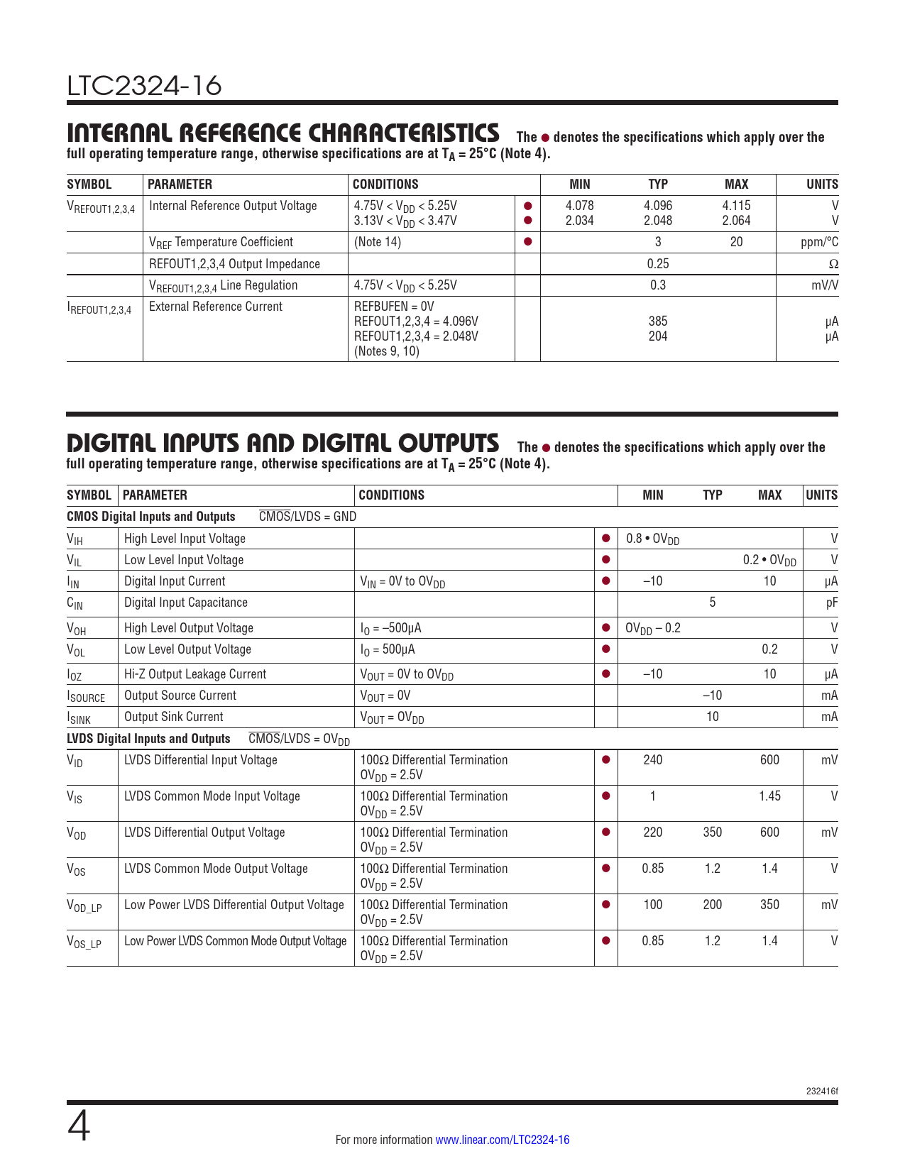 LTC2324-16 INTERNAL REFERENCE CHARACTERISTICSThe l denotes the specifications which apply over thefull operating temperature range, otherwise specifications are at TA = 25°C (Note 4).SYMBOLPARAMETERCONDITIONSMINTYPMAXUNITS VREFOUT1,2,3,4 Internal Reference Output Voltage 4.75V < VDD < 5.25V l 4.078 4.096 4.115 V 3.13V < VDD < 3.47V l 2.034 2.048 2.064 V VREF Temperature Coefficient (Note 14) l 3 20 ppm/°C REFOUT1,2,3,4 Output Impedance 0.25 Ω VREFOUT1,2,3,4 Line Regulation 4.75V < VDD < 5.25V 0.3 mV/V IREFOUT1,2,3,4 External Reference Current REFBUFEN = 0V REFOUT1,2,3,4 = 4.096V 385 μA REFOUT1,2,3,4 = 2.048V 204 μA (Notes 9, 10) DIGITAL INPUTS AND DIGITAL OUTPUTSThe l denotes the specifications which apply over thefull operating temperature range, otherwise specifications are at TA = 25°C (Note 4).SYMBOL PARAMETERCONDITIONSMINTYPMAXUNITSCMOS Digital Inputs and Outputs CMOS/LVDS = GND VIH High Level Input Voltage l 0.8 • OVDD V VIL Low Level Input Voltage l 0.2 • OVDD V IIN Digital Input Current VIN = 0V to OVDD l –10 10 μA CIN Digital Input Capacitance 5 pF VOH High Level Output Voltage IO = –500μA l OVDD – 0.2 V VOL Low Level Output Voltage IO = 500μA l 0.2 V IOZ Hi-Z Output Leakage Current VOUT = 0V to OVDD l –10 10 μA ISOURCE Output Source Current VOUT = 0V –10 mA ISINK Output Sink Current VOUT = OVDD 10 mA LVDS Digital Inputs and Outputs CMOS/LVDS = OVDD VID LVDS Differential Input Voltage 100Ω Differential Termination l 240 600 mV OVDD = 2.5V VIS LVDS Common Mode Input Voltage 100Ω Differential Termination l 1 1.45 V OVDD = 2.5V VOD LVDS Differential Output Voltage 100Ω Differential Termination l 220 350 600 mV OVDD = 2.5V VOS LVDS Common Mode Output Voltage 100Ω Differential Termination l 0.85 1.2 1.4 V OVDD = 2.5V VOD_LP Low Power LVDS Differential Output Voltage 100Ω Differential Termination l 100 200 350 mV OVDD = 2.5V VOS_LP Low Power LVDS Common Mode Output Voltage 100Ω Differential Termination l 0.85 1.2 1.4 V OVDD = 2.5V 232416f 4 For more information www.linear.com/LTC2324-16 Document Outline Features Applications Description Typical Application Absolute Maximum Ratings Pin Configuration Order Information Electrical Characteristics Converter Characteristics Dynamic Accuracy Internal Reference Characteristics Digital Inputs And Digital Outputs Power Requirements ADC Timing Characteristics Typical Performance Characteristics Pin Functions Functional Block Diagram Timing Diagram Applications Information Package Description Related Parts Features Applications Typical Application Description Absolute Maximum Ratings Order Information Pin Configuration Electrical Characteristics Converter Characteristics Dynamic Accuracy Internal Reference Characteristics Digital Inputs And Digital Outputs Power Requirements ADC Timing Characteristics ADC Timing Characteristics ADC Timing Characteristics Typical Performance Characteristics Pin Functions Functional Block Diagram Timing Diagram Applications Information Package Description Typical Application Related Parts