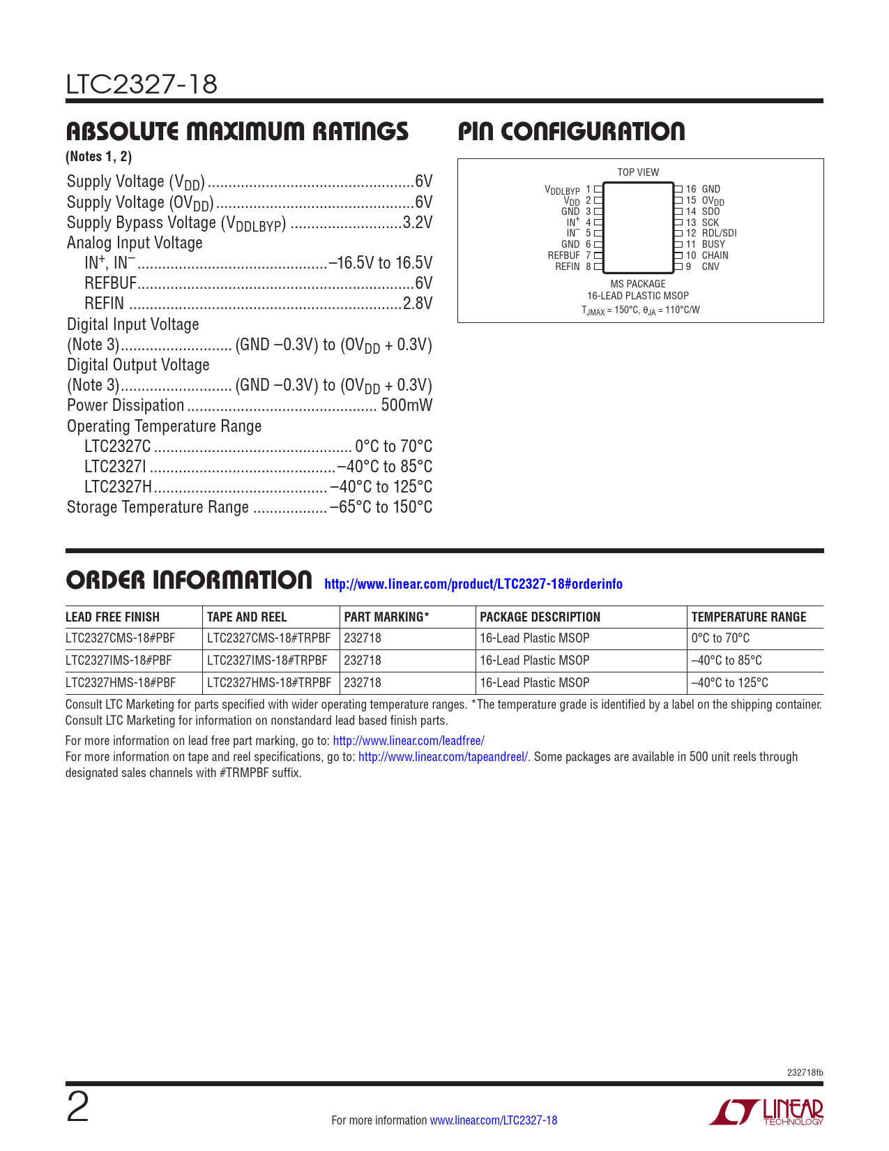 LTC2327-18 absoluTe MaxiMuM raTingspin conFiguraTion(Notes 1, 2) Supply Voltage (V TOP VIEW DD) ..6V VDDLBYP 1 16 GND Supply Voltage (OVDD) ..6V VDD 2 15 OVDD Supply Bypass Voltage (V GND 3 14 SDO DDLBYP) ...3.2V IN+ 4 13 SCK Analog Input Voltage IN– 5 12 RDL/SDI GND 6 11 BUSY IN+, IN– ..–16.5V to 16.5V REFBUF 7 10 CHAIN REFIN 8 9 CNV REFBUF ...6V MS PACKAGE REFIN ..2.8V 16-LEAD PLASTIC MSOP T Digital Input Voltage JMAX = 150°C, θJA = 110°C/W (Note 3) ... (GND –0.3V) to (OVDD + 0.3V) Digital Output Voltage (Note 3) ... (GND –0.3V) to (OVDD + 0.3V) Power Dissipation .. 500mW Operating Temperature Range LTC2327C .. 0°C to 70°C LTC2327I ...–40°C to 85°C LTC2327H .. –40°C to 125°C Storage Temperature Range .. –65°C to 150°C orDer inForMaTion http://www.linear.com/product/LTC2327-18#orderinfoLEAD FREE FINISHTAPE AND REELPART MARKING*PACKAGE DESCRIPTIONTEMPERATURE RANGE LTC2327CMS-18#PBF LTC2327CMS-18#TRPBF 232718 16-Lead Plastic MSOP 0°C to 70°C LTC2327IMS-18#PBF LTC2327IMS-18#TRPBF 232718 16-Lead Plastic MSOP –40°C to 85°C LTC2327HMS-18#PBF LTC2327HMS-18#TRPBF 232718 16-Lead Plastic MSOP –40°C to 125°C Consult LTC Marketing for parts specified with wider operating temperature ranges. *The temperature grade is identified by a label on the shipping container. Consult LTC Marketing for information on nonstandard lead based finish parts. For more information on lead free part marking, go to: http://www.linear.com/leadfree/ For more information on tape and reel specifications, go to: http://www.linear.com/tapeandreel/. Some packages are available in 500 unit reels through designated sales channels with #TRMPBF suffix. 232718fb 2 For more information www.linear.com/LTC2327-18 Document Outline Features Applications Typical Application Description Absolute Maximum Ratings Order Information Pin Configuration Electrical Characteristics Converter Characteristics Dynamic Accuracy Internal Reference Characteristics Reference Buffer Characteristics Digital Inputs and Digital Outputs Power Requirements ADC Timing Characteristics Typical Performance Characteristics Pin Functions Functional Block Diagram Timing Diagram Applications Information Board Layout Package Description Revision History Typical Application Related Parts