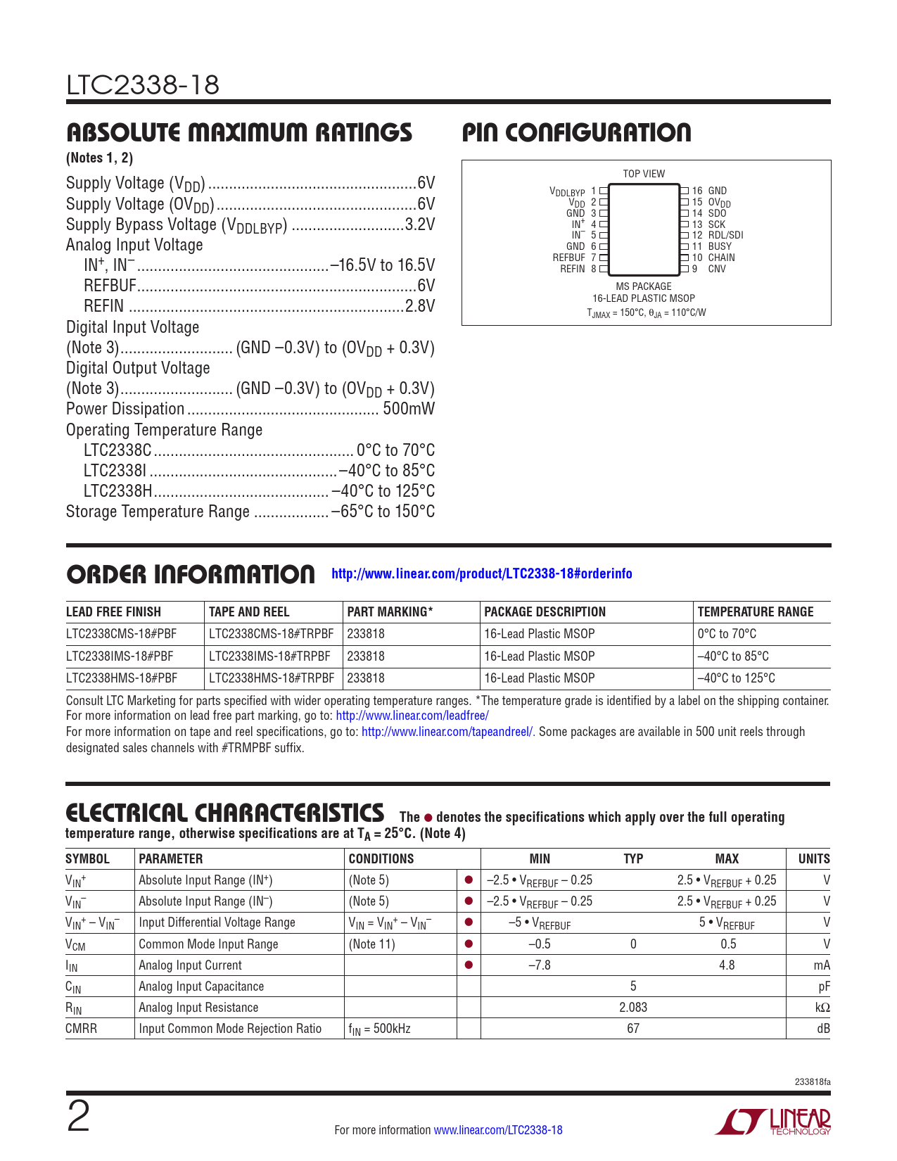 LTC2338CMS-18#PBF LTC2338CMS-18#TRPBF 233818 16-Lead Plastic MSOP 0°C to 70°C LTC2338IMS-18#PBF LTC2338IMS-18#TRPBF 233818 16-Lead Plastic MSOP –40°C to 85°C LTC2338HMS-18#PBF LTC2338HMS-18#TRPBF 233818 16-Lead Plastic MSOP –40°C to 125°C Consult LTC Marketing for parts specified with wider operating temperature ranges. *The temperature grade is identified by a label on the shipping container. For more information on lead free part marking, go to: http://www.linear.com/leadfree/ For more information on tape and reel specifications, go to: http://www.linear.com/tapeandreel/. Some packages are available in 500 unit reels through designated sales channels with #TRMPBF suffix.