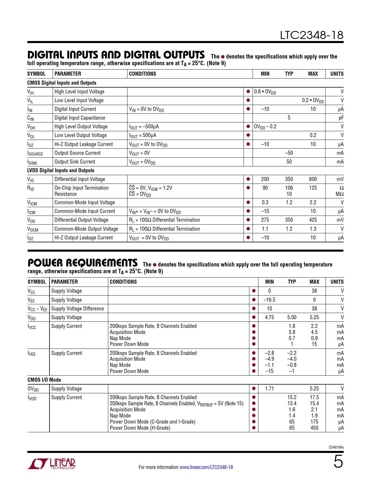 LTC2348-18 DigiTal inpuTs anD DigiTal ouTpuTs The l denotes the specifications which apply over thefull operating temperature range, otherwise specifications are at TA = 25°C. (Note 9) SYMBOLPARAMETERCONDITIONSMINTYPMAXUNITSCMOS Digital Inputs and Outputs VIH High Level Input Voltage l 0.8 • OVDD V VIL Low Level Input Voltage l 0.2 • OVDD V IIN Digital Input Current VIN = 0V to OVDD l –10 10 μA CIN Digital Input Capacitance 5 pF VOH High Level Output Voltage IOUT = –500μA l OVDD – 0.2 V VOL Low Level Output Voltage IOUT = 500μA l 0.2 V IOZ Hi-Z Output Leakage Current VOUT = 0V to OVDD l –10 10 μA ISOURCE Output Source Current VOUT = 0V –50 mA ISINK Output Sink Current VOUT = OVDD 50 mA LVDS Digital Inputs and Outputs VID Differential Input Voltage l 200 350 600 mV RID On-Chip Input Termination CS = 0V, VICM = 1.2V l 90 106 125 Ω Resistance CS = OVDD 10 MΩ VICM Common-Mode Input Voltage l 0.3 1.2 2.2 V IICM Common-Mode Input Current VIN+ = VIN– = 0V to OVDD l –10 10 μA VOD Differential Output Voltage RL = 100Ω Differential Termination l 275 350 425 mV VOCM Common-Mode Output Voltage RL = 100Ω Differential Termination l 1.1 1.2 1.3 V IOZ Hi-Z Output Leakage Current VOUT = 0V to OVDD l –10 10 μA p ower requireMenTs The l denotes the specifications which apply over the full operating temperaturerange, otherwise specifications are at TA = 25°C. (Note 9) SYMBOL PARAMETERCONDITIONSMINTYPMAXUNITS VCC Supply Voltage l 0 38 V VEE Supply Voltage l –16.5 0 V VCC − VEE Supply Voltage Difference l 10 38 V VDD Supply Voltage l 4.75 5.00 5.25 V IVCC Supply Current 200ksps Sample Rate, 8 Channels Enabled l 1.8 2.2 mA Acquisition Mode l 3.8 4.5 mA Nap Mode l 0.7 0.9 mA Power Down Mode l 1 15 μA IVEE Supply Current 200ksps Sample Rate, 8 Channels Enabled l –2.8 –2.2 mA Acquisition Mode l –4.9 –4.0 mA Nap Mode l –1.1 –0.8 mA Power Down Mode l –15 –1 μA CMOS I/O Mode OVDD Supply Voltage l 1.71 5.25 V IVDD Supply Current 200ksps Sample Rate, 8 Channels Enabled l 15.2 17.5 mA 200ksps Sample Rate, 8 Channels Enabled, VREFBUF = 5V (Note 15) l 13.4 15.4 mA Acquisition Mode l 1.6 2.1 mA Nap Mode l 1.4 1.9 mA Power Down Mode (C-Grade and I-Grade) l 65 175 μA Power Down Mode (H-Grade) l 65 450 µA 234818fa For more information www.linear.com/LTC2348-18 5 Document Outline Features Description Applications Typical Application Absolute Maximum Ratings Pin Configuration Order Information Electrical Characteristics Converter Characteristics Dynamic Accuracy Internal Reference Characteristics Reference Buffer Characteristics Digital Inputs and Digital Outputs Power Requirements ADC Timing Characteristics Typical Performance Characteristics Pin Functions Configuration Tables Functional Block Diagram Timing Diagram Applications Information Board Layout Package Description Revision History Typical Application Related Parts