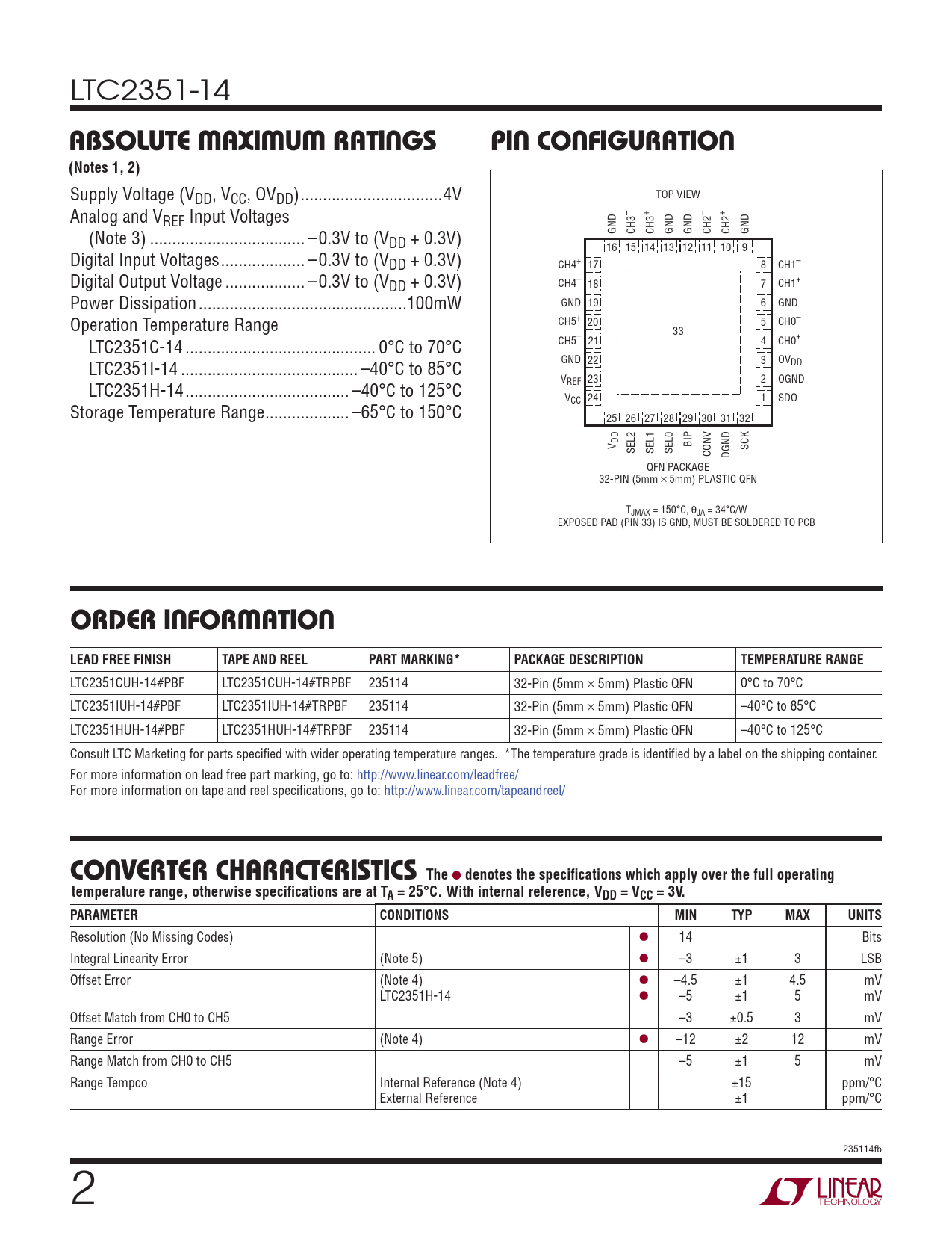 LTC2351CUH-14#PBF LTC2351CUH-14#TRPBF 235114 32-Pin (5mm × 5mm) Plastic QFN 0°C to 70°C LTC2351IUH-14#PBF LTC2351IUH-14#TRPBF 235114 32-Pin (5mm × 5mm) Plastic QFN –40°C to 85°C LTC2351HUH-14#PBF LTC2351HUH-14#TRPBF 235114 32-Pin (5mm × 5mm) Plastic QFN –40°C to 125°C Consult LTC Marketing for parts specifi ed with wider operating temperature ranges. *The temperature grade is identifi ed by a label on the shipping container. For more information on lead free part marking, go to: http://www.linear.com/leadfree/ For more information on tape and reel specifi cations, go to: http://www.linear.com/tapeandreel/
