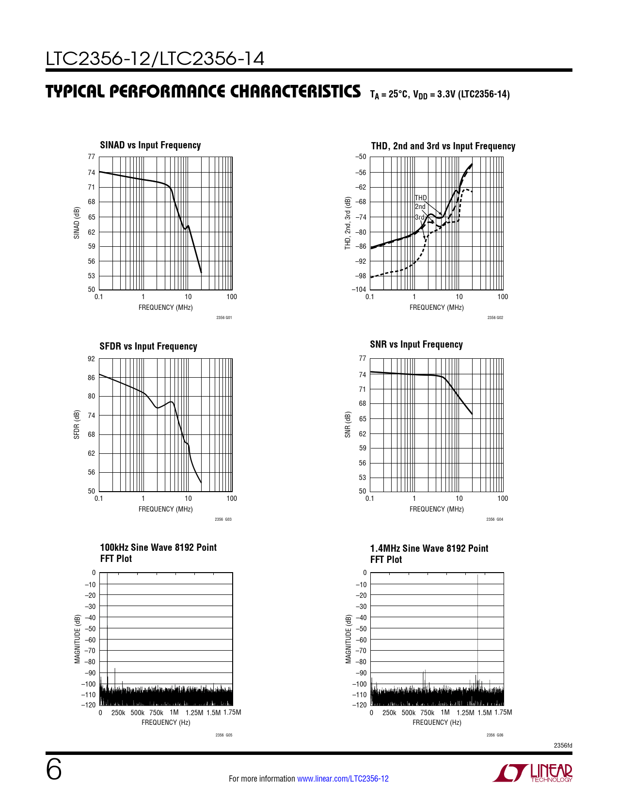 typical perFormance characteristics TA = 25°C, VDD = 3.3V (LTC2356-14) SINAD vs Input Frequency THD, 2nd and 3rd vs Input Frequency