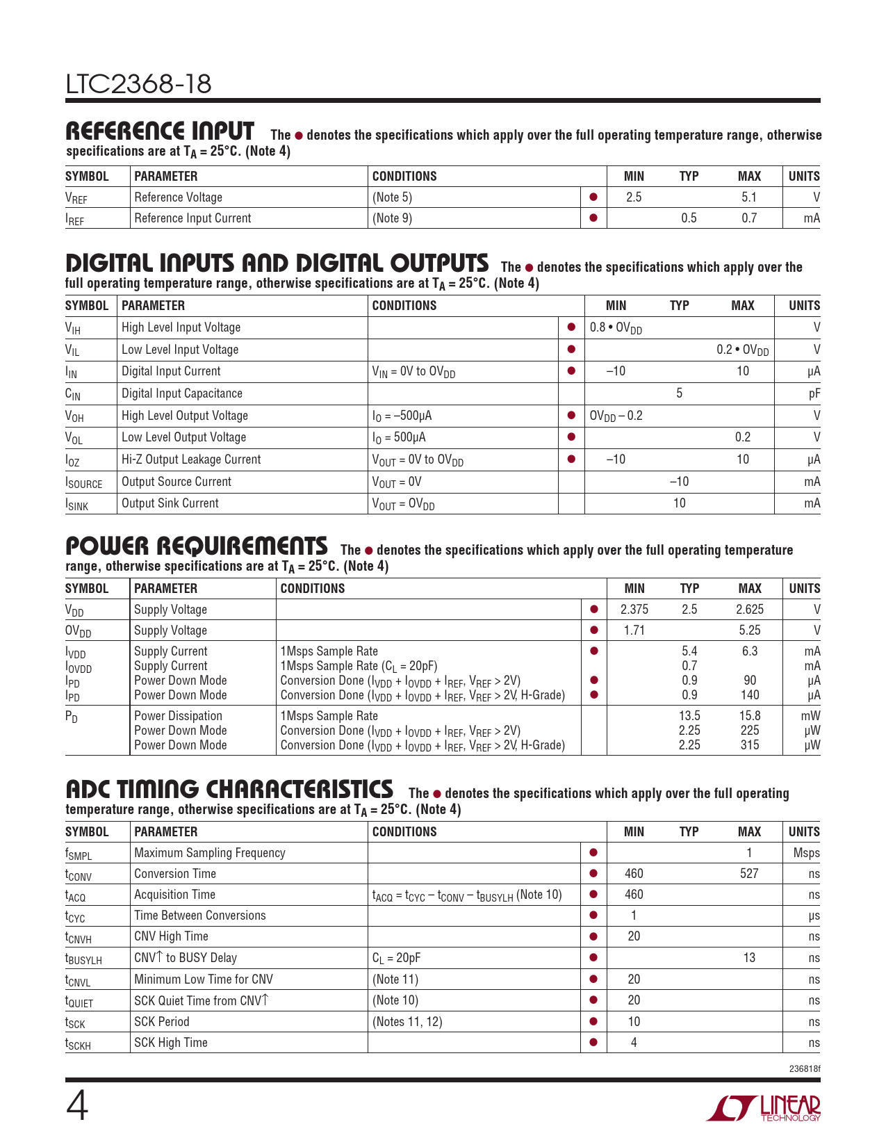 LTC2368-18 REFERENCE INPUTThe l denotes the specifications which apply over the full operating temperature range, otherwisespecifications are at TA = 25°C. (Note 4)SYMBOLPARAMETERCONDITIONSMINTYPMAXUNITS VREF Reference Voltage (Note 5) l 2.5 5.1 V IREF Reference Input Current (Note 9) l 0.5 0.7 mA DIGITAL INPUTS AND DIGITAL OUTPUTSThe l denotes the specifications which apply over thefull operating temperature range, otherwise specifications are at TA = 25°C. (Note 4) SYMBOL PARAMETERCONDITIONSMINTYPMAXUNITS VIH High Level Input Voltage l 0.8 • OVDD V VIL Low Level Input Voltage l 0.2 • OVDD V IIN Digital Input Current VIN = 0V to OVDD l –10 10 µA CIN Digital Input Capacitance 5 pF VOH High Level Output Voltage IO = –500µA l OVDD – 0.2 V VOL Low Level Output Voltage IO = 500µA l 0.2 V IOZ Hi-Z Output Leakage Current VOUT = 0V to OVDD l –10 10 µA ISOURCE Output Source Current VOUT = 0V –10 mA ISINK Output Sink Current VOUT = OVDD 10 mA POWER REQUIREMENTSThe l denotes the specifications which apply over the full operating temperaturerange, otherwise specifications are at TA = 25°C. (Note 4)SYMBOLPARAMETERCONDITIONSMINTYPMAXUNITS VDD Supply Voltage l 2.375 2.5 2.625 V OVDD Supply Voltage l 1.71 5.25 V IVDD Supply Current 1Msps Sample Rate l 5.4 6.3 mA IOVDD Supply Current 1Msps Sample Rate (CL = 20pF) 0.7 mA IPD Power Down Mode Conversion Done (IVDD + IOVDD + IREF, VREF > 2V) l 0.9 90 µA IPD Power Down Mode Conversion Done (IVDD + IOVDD + IREF, VREF > 2V, H-Grade) l 0.9 140 µA PD Power Dissipation 1Msps Sample Rate 13.5 15.8 mW Power Down Mode Conversion Done (IVDD + IOVDD + IREF, VREF > 2V) 2.25 225 µW Power Down Mode Conversion Done (IVDD + IOVDD + IREF, VREF > 2V, H-Grade) 2.25 315 µW ADC TIMING CHARACTERISTICSThe l denotes the specifications which apply over the full operatingtemperature range, otherwise specifications are at TA = 25°C. (Note 4)SYMBOLPARAMETERCONDITIONSMINTYPMAXUNITS fSMPL Maximum Sampling Frequency l 1 Msps tCONV Conversion Time l 460 527 ns tACQ Acquisition Time tACQ = tCYC – tCONV – tBUSYLH (Note 10) l 460 ns tCYC Time Between Conversions l 1 µs tCNVH CNV High Time l 20 ns tBUSYLH CNV↑ to BUSY Delay CL = 20pF l 13 ns tCNVL Minimum Low Time for CNV (Note 11) l 20 ns tQUIET SCK Quiet Time from CNV↑ (Note 10) l 20 ns tSCK SCK Period (Notes 11, 12) l 10 ns tSCKH SCK High Time l 4 ns 236818f 4 Document Outline Features Applications Description Typical Application Absolute Maximum Ratings Pin Configuration Order Information Electrical Characteristics Converter Characteristics Dynamic Accuracy Reference Input Digital Inputs And Digital Outputs Power Requirements ADC Timing Characteristics Typical Performance Characteristics Pin Functions Functional Block Diagram Timing Diagram Applications Information Timing Diagrams Board Layout Package Description Typical Application Related Parts