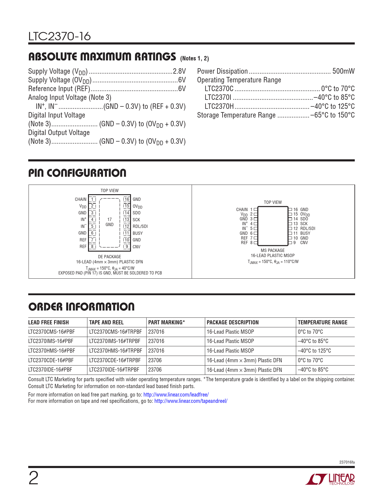 LTC2370-16 ABSOLUTE MAXIMUM RATINGS (Notes 1, 2) Supply Voltage (VDD) ...2.8V Power Dissipation .. 500mW Supply Voltage (OVDD) ..6V Operating Temperature Range Reference Input (REF) ...6V LTC2370C .. 0°C to 70°C Analog Input Voltage (Note 3) LTC2370I ...–40°C to 85°C IN+, IN– ...(GND – 0.3V) to (REF + 0.3V) LTC2370H .. –40°C to 125°C Digital Input Voltage Storage Temperature Range .. –65°C to 150°C (Note 3) .. (GND – 0.3V) to (OVDD + 0.3V) Digital Output Voltage (Note 3) .. (GND – 0.3V) to (OVDD + 0.3V) PIN CONFIGURATION TOP VIEW CHAIN 1 16 GND TOP VIEW VDD 2 15 OVDD CHAIN 1 16 GND GND 3 14 SDO VDD 2 15 OVDD IN+ 4 17 13 SCK GND 3 14 SDO GND IN– 5 12 IN+ 4 13 SCK RDL/SDI IN– 5 12 RDL/SDI GND 6 11 BUSY GND 6 11 BUSY REF 7 10 GND REF 7 10 GND REF 8 9 CNV REF 8 9 CNV MS PACKAGE DE PACKAGE 16-LEAD PLASTIC MSOP 16-LEAD (4mm × 3mm) PLASTIC DFN TJMAX = 150°C, θJA = 110°C/W TJMAX = 150°C, θJA = 40°C/W EXPOSED PAD (PIN 17) IS GND, MUST BE SOLDERED TO PCB ORDER INFORMATION LEAD FREE FINISHTAPE AND REELPART MARKING*PACKAGE DESCRIPTIONTEMPERATURE RANGE LTC2370CMS-16#PBF LTC2370CMS-16#TRPBF 237016 16-Lead Plastic MSOP 0°C to 70°C LTC2370IMS-16#PBF LTC2370IMS-16#TRPBF 237016 16-Lead Plastic MSOP –40°C to 85°C LTC2370HMS-16#PBF LTC2370HMS-16#TRPBF 237016 16-Lead Plastic MSOP –40°C to 125°C LTC2370CDE-16#PBF LTC2370CDE-16#TRPBF 23706 16-Lead (4mm × 3mm) Plastic DFN 0°C to 70°C LTC2370IDE-16#PBF LTC2370IDE-16#TRPBF 23706 16-Lead (4mm × 3mm) Plastic DFN –40°C to 85°C Consult LTC Marketing for parts specified with wider operating temperature ranges. *The temperature grade is identified by a label on the shipping container. Consult LTC Marketing for information on non-standard lead based finish parts. For more information on lead free part marking, go to: http://www.linear.com/leadfree/ For more information on tape and reel specifications, go to: http://www.linear.com/tapeandreel/ 237016fa 2 Document Outline Features Applications Description Typical Application Absolute Maximum Ratings Pin Configuration Order Information Electrical Characteristics Converter Characteristics Dynamic Accuracy Reference Input Digital Inputs And Digital Outputs Power Requirements ADC Timing Characteristics Typical Performance Characteristics Pin Functions Functional Block Diagram Timing Diagram Applications Information Timing Diagrams Board Layout Package Description Revision History Typical Application Related Parts