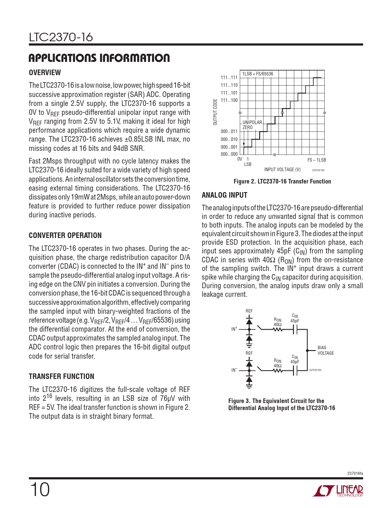 LTC2370-16 APPLICATIONS INFORMATIONOVERVIEW 1LSB = FS/65536 111...111 The LTC2370-16 is a low noise, low power, high speed 16-bit 111...110 successive approximation register (SAR) ADC. Operating 111...101 from a single 2.5V supply, the LTC2370-16 supports a 111...100 0V to VREF pseudo-differential unipolar input range with VREF ranging from 2.5V to 5.1V, making it ideal for high OUTPUT CODE UNIPOLAR performance applications which require a wide dynamic ZERO 000...011 range. The LTC2370-16 achieves ±0.85LSB INL max, no 000...010 missing codes at 16 bits and 94dB SNR. 000...001 000...000 Fast 2Msps throughput with no cycle latency makes the 0V 1 FS – 1LSB LSB LTC2370-16 ideally suited for a wide variety of high speed INPUT VOLTAGE (V) 237016 F02 applications. An internal oscillator sets the conversion time, Figure 2. LTC2370-16 Transfer Function easing external timing considerations. The LTC2370-16 dissipates only 19mW at 2Msps, while an auto power-down ANALOG INPUT feature is provided to further reduce power dissipation The analog inputs of the LTC2370-16 are pseudo-differential during inactive periods. in order to reduce any unwanted signal that is common to both inputs. The analog inputs can be modeled by the CONVERTER OPERATION equivalent circuit shown in Figure 3. The diodes at the input provide ESD protection. In the acquisition phase, each The LTC2370-16 operates in two phases. During the ac- input sees approximately 45pF (C quisition phase, the charge redistribution capacitor D/A IN) from the sampling CDAC in series with 40Ω (R converter (CDAC) is connected to the IN+ and IN– pins to ON) from the on-resistance of the sampling switch. The IN+ input draws a current sample the pseudo-differential analog input voltage. A ris- spike while charging the CIN capacitor during acquisition. ing edge on the CNV pin initiates a conversion. During the During conversion, the analog inputs draw only a small conversion phase, the 16-bit CDAC is sequenced through a leakage current. successive approximation algorithm, effectively comparing the sampled input with binary-weighted fractions of the REF reference voltage (e.g. V CIN REF/2, VREF/4 … VREF/65536) using RON 45pF the differential comparator. At the end of conversion, the 40Ω IN+ CDAC output approximates the sampled analog input. The ADC control logic then prepares the 16-bit digital output BIAS code for serial transfer. REF VOLTAGE C R IN ON 45pF 40Ω IN– 237016 F03 TRANSFER FUNCTION The LTC2370-16 digitizes the full-scale voltage of REF into 216 levels, resulting in an LSB size of 76µV with Figure 3. The Equivalent Circuit for the REF = 5V. The ideal transfer function is shown in Figure 2. Differential Analog Input of the LTC2370-16 The output data is in straight binary format. 237016fa 10 Document Outline Features Applications Description Typical Application Absolute Maximum Ratings Pin Configuration Order Information Electrical Characteristics Converter Characteristics Dynamic Accuracy Reference Input Digital Inputs And Digital Outputs Power Requirements ADC Timing Characteristics Typical Performance Characteristics Pin Functions Functional Block Diagram Timing Diagram Applications Information Timing Diagrams Board Layout Package Description Revision History Typical Application Related Parts