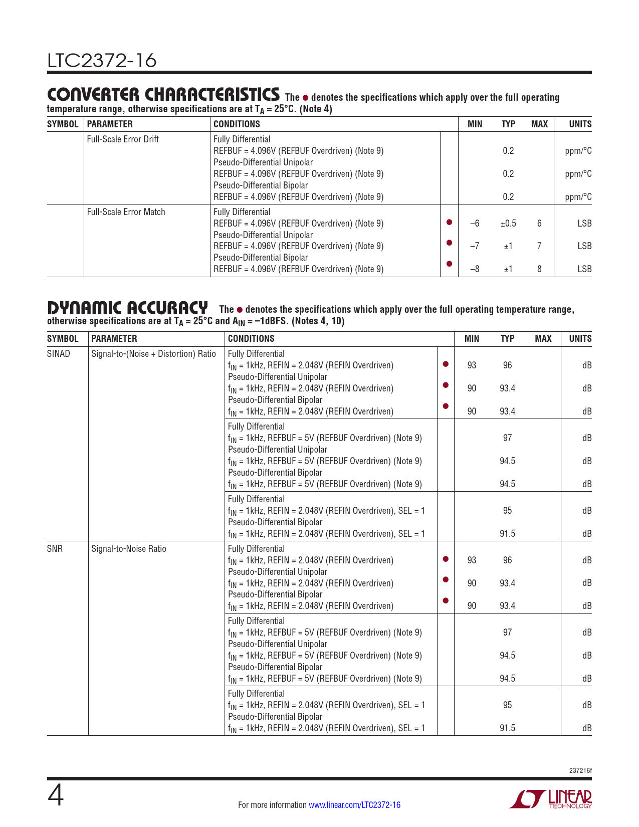 LTC2372-16 c onverTer characTerisTics The l denotes the specifications which apply over the full operatingtemperature range, otherwise specifications are at TA = 25°C. (Note 4) SYMBOL PARAMETERCONDITIONSMINTYPMAXUNITS Full-Scale Error Drift Fully Differential REFBUF = 4.096V (REFBUF Overdriven) (Note 9) 0.2 ppm/°C Pseudo-Differential Unipolar REFBUF = 4.096V (REFBUF Overdriven) (Note 9) 0.2 ppm/°C Pseudo-Differential Bipolar REFBUF = 4.096V (REFBUF Overdriven) (Note 9) 0.2 ppm/°C Full-Scale Error Match Fully Differential REFBUF = 4.096V (REFBUF Overdriven) (Note 9) l –6 ±0.5 6 LSB Pseudo-Differential Unipolar REFBUF = 4.096V (REFBUF Overdriven) (Note 9) l –7 ±1 7 LSB Pseudo-Differential Bipolar REFBUF = 4.096V (REFBUF Overdriven) (Note 9) l –8 ±1 8 LSB DynaMic accuracy The l denotes the specifications which apply over the full operating temperature range,otherwise specifications are at TA = 25°C and AIN = –1dBFS. (Notes 4, 10) SYMBOLPARAMETERCONDITIONSMINTYPMAXUNITS SINAD Signal-to-(Noise + Distortion) Ratio Fully Differential fIN = 1kHz, REFIN = 2.048V (REFIN Overdriven) l 93 96 dB Pseudo-Differential Unipolar f l IN = 1kHz, REFIN = 2.048V (REFIN Overdriven) 90 93.4 dB Pseudo-Differential Bipolar f l IN = 1kHz, REFIN = 2.048V (REFIN Overdriven) 90 93.4 dB Fully Differential fIN = 1kHz, REFBUF = 5V (REFBUF Overdriven) (Note 9) 97 dB Pseudo-Differential Unipolar fIN = 1kHz, REFBUF = 5V (REFBUF Overdriven) (Note 9) 94.5 dB Pseudo-Differential Bipolar fIN = 1kHz, REFBUF = 5V (REFBUF Overdriven) (Note 9) 94.5 dB Fully Differential fIN = 1kHz, REFIN = 2.048V (REFIN Overdriven), SEL = 1 95 dB Pseudo-Differential Bipolar fIN = 1kHz, REFIN = 2.048V (REFIN Overdriven), SEL = 1 91.5 dB SNR Signal-to-Noise Ratio Fully Differential fIN = 1kHz, REFIN = 2.048V (REFIN Overdriven) l 93 96 dB Pseudo-Differential Unipolar f l IN = 1kHz, REFIN = 2.048V (REFIN Overdriven) 90 93.4 dB Pseudo-Differential Bipolar f l IN = 1kHz, REFIN = 2.048V (REFIN Overdriven) 90 93.4 dB Fully Differential fIN = 1kHz, REFBUF = 5V (REFBUF Overdriven) (Note 9) 97 dB Pseudo-Differential Unipolar fIN = 1kHz, REFBUF = 5V (REFBUF Overdriven) (Note 9) 94.5 dB Pseudo-Differential Bipolar fIN = 1kHz, REFBUF = 5V (REFBUF Overdriven) (Note 9) 94.5 dB Fully Differential fIN = 1kHz, REFIN = 2.048V (REFIN Overdriven), SEL = 1 95 dB Pseudo-Differential Bipolar fIN = 1kHz, REFIN = 2.048V (REFIN Overdriven), SEL = 1 91.5 dB 237216f 4 For more information www.linear.com/LTC2372-16 Document Outline Features Applications Typical Application Description Absolute Maximum Ratings Order Information Pin Configuration Electrical Characteristics Converter Characteristics Dynamic Accuracy Internal Reference Characteristics Reference Buffer Characteristics Digital Inputs and Digital Outputs Power Requirements ADC Timing Characteristics Electrical Characteristics Typical Performance Characteristics Pin Functions Functional Block Diagram Timing Diagram Applications Information Timing Diagrams Board Layout Schematics Package Description Typical Application Related Parts