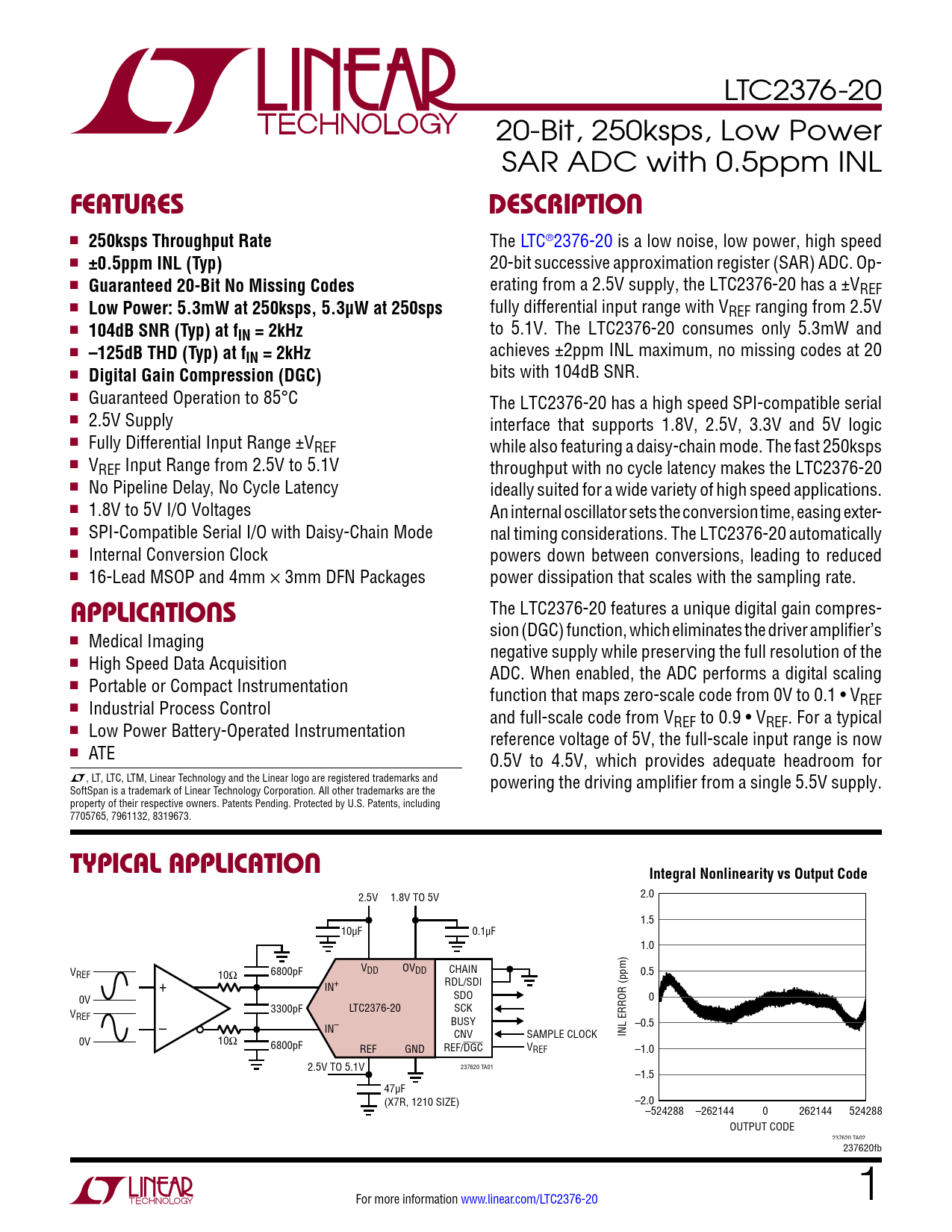 LTC2376-20 20-Bit, 250ksps, Low Power SAR ADC with 0.5ppm INL