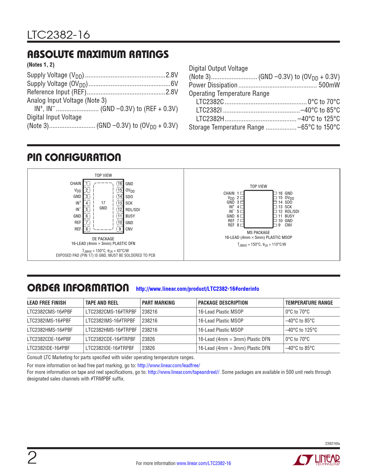 ORDER INFORMATION http://www.linear.com/product/LTC2382-16#orderinfo LEAD FREE FINISH TAPE AND REEL PART MARKING PACKAGE DESCRIPTION TEMPERATURE RANGE