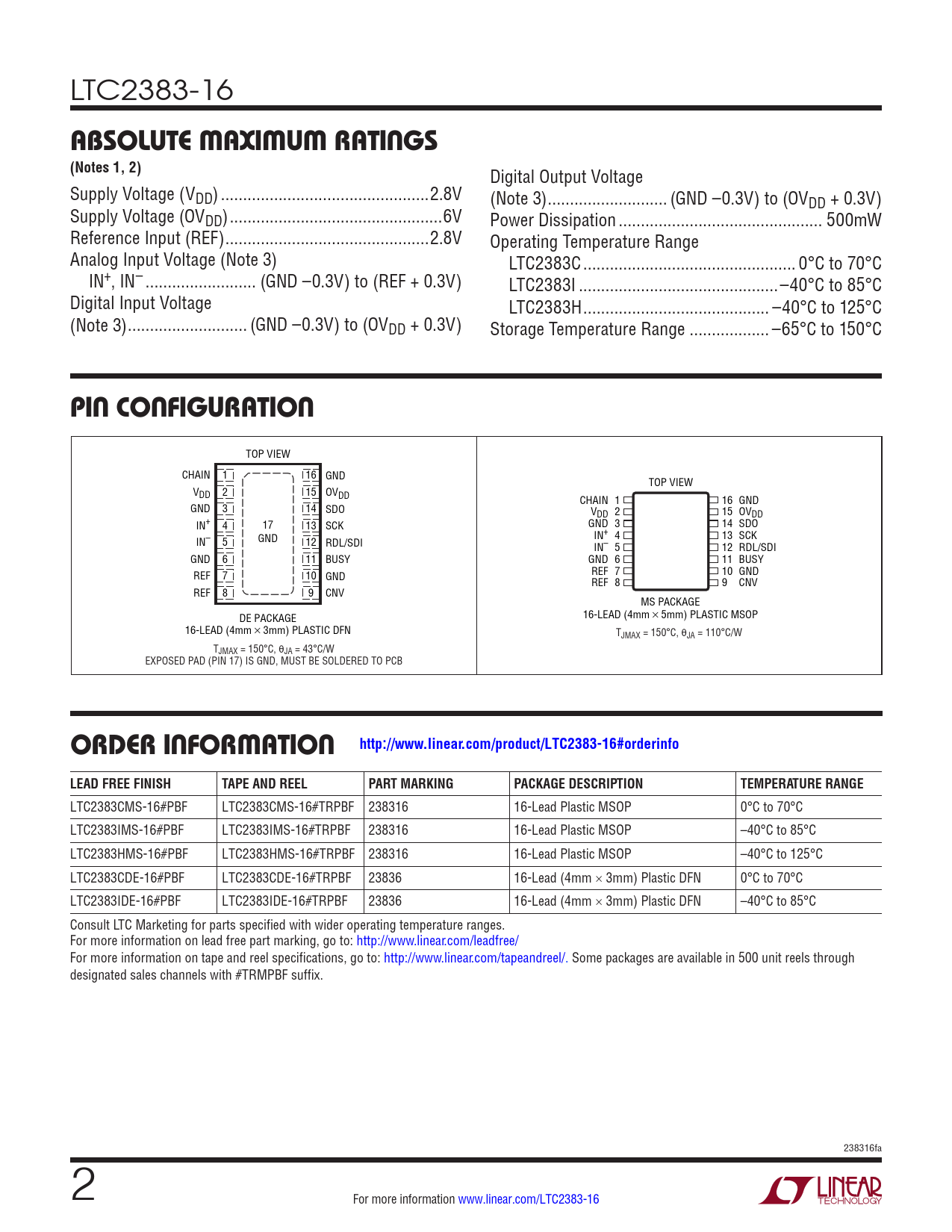 LTC2383-16 ABSOLUTE MAXIMUM RATINGS (Notes 1, 2) Digital Output Voltage Supply Voltage (VDD) ...2.8V (Note 3) ... (GND –0.3V) to (OVDD + 0.3V) Supply Voltage (OVDD) ..6V Power Dissipation .. 500mW Reference Input (REF) ..2.8V Operating Temperature Range Analog Input Voltage (Note 3) LTC2383C .. 0°C to 70°C IN+, IN– ... (GND –0.3V) to (REF + 0.3V) LTC2383I ...–40°C to 85°C Digital Input Voltage LTC2383H .. –40°C to 125°C (Note 3) ... (GND –0.3V) to (OVDD + 0.3V) Storage Temperature Range .. –65°C to 150°C PIN CONFIGURATION TOP VIEW CHAIN 1 16 GND TOP VIEW VDD 2 15 OVDD CHAIN 1 16 GND GND 3 14 SDO VDD 2 15 OVDD IN+ 4 17 13 SCK GND 3 14 SDO GND IN+ 4 13 SCK IN– 5 12 RDL/SDI IN– 5 12 RDL/SDI GND 6 11 BUSY GND 6 11 BUSY REF 7 10 GND REF 7 10 GND REF 8 9 CNV REF 8 9 CNV MS PACKAGE DE PACKAGE 16-LEAD (4mm × 5mm) PLASTIC MSOP 16-LEAD (4mm × 3mm) PLASTIC DFN TJMAX = 150°C, θJA = 110°C/W TJMAX = 150°C, θJA = 43°C/W EXPOSED PAD (PIN 17) IS GND, MUST BE SOLDERED TO PCB ORDER INFORMATION http://www.linear.com/product/LTC2383-16#orderinfoLEAD FREE FINISHTAPE AND REELPART MARKINGPACKAGE DESCRIPTIONTEMPERATURE RANGE LTC2383CMS-16#PBF LTC2383CMS-16#TRPBF 238316 16-Lead Plastic MSOP 0°C to 70°C LTC2383IMS-16#PBF LTC2383IMS-16#TRPBF 238316 16-Lead Plastic MSOP –40°C to 85°C LTC2383HMS-16#PBF LTC2383HMS-16#TRPBF 238316 16-Lead Plastic MSOP –40°C to 125°C LTC2383CDE-16#PBF LTC2383CDE-16#TRPBF 23836 16-Lead (4mm × 3mm) Plastic DFN 0°C to 70°C LTC2383IDE-16#PBF LTC2383IDE-16#TRPBF 23836 16-Lead (4mm × 3mm) Plastic DFN –40°C to 85°C Consult LTC Marketing for parts specified with wider operating temperature ranges. For more information on lead free part marking, go to: http://www.linear.com/leadfree/ For more information on tape and reel specifications, go to: http://www.linear.com/tapeandreel/. Some packages are available in 500 unit reels through designated sales channels with #TRMPBF suffix. 238316fa 2 For more information www.linear.com/LTC2383-16