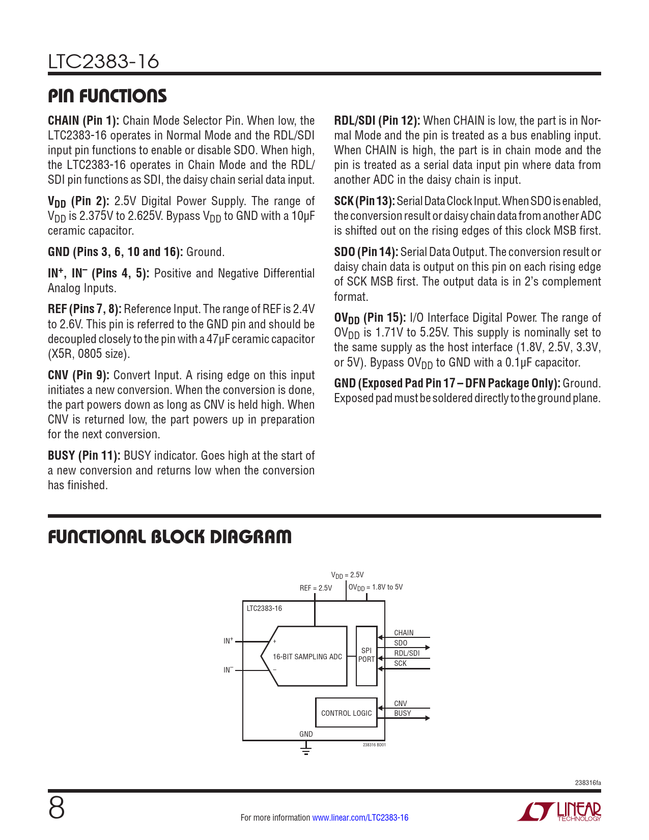 LTC2383-16 PIN FUNCTIONS CHAIN (Pin 1): Chain Mode Selector Pin. When low, the RDL/SDI (Pin 12): When CHAIN is low, the part is in Nor- LTC2383-16 operates in Normal Mode and the RDL/SDI mal Mode and the pin is treated as a bus enabling input. input pin functions to enable or disable SDO. When high, When CHAIN is high, the part is in chain mode and the the LTC2383-16 operates in Chain Mode and the RDL/ pin is treated as a serial data input pin where data from SDI pin functions as SDI, the daisy chain serial data input. another ADC in the daisy chain is input. VDD (Pin 2): 2.5V Digital Power Supply. The range of SCK (Pin 13): Serial Data Clock Input. When SDO is enabled, VDD is 2.375V to 2.625V. Bypass VDD to GND with a 10µF the conversion result or daisy chain data from another ADC ceramic capacitor. is shifted out on the rising edges of this clock MSB first. GND (Pins 3, 6, 10 and 16): Ground. SDO (Pin 14): Serial Data Output. The conversion result or IN+, IN– (Pins 4, 5): Positive and Negative Differential daisy chain data is output on this pin on each rising edge Analog Inputs. of SCK MSB first. The output data is in 2’s complement format. REF (Pins 7, 8): Reference Input. The range of REF is 2.4V to 2.6V. This pin is referred to the GND pin and should be OVDD (Pin 15): I/O Interface Digital Power. The range of decoupled closely to the pin with a 47µF ceramic capacitor OVDD is 1.71V to 5.25V. This supply is nominally set to (X5R, 0805 size). the same supply as the host interface (1.8V, 2.5V, 3.3V, or 5V). Bypass OVDD to GND with a 0.1µF capacitor. CNV (Pin 9): Convert Input. A rising edge on this input initiates a new conversion. When the conversion is done, GND (Exposed Pad Pin 17 – DFN Package Only): Ground. the part powers down as long as CNV is held high. When Exposed pad must be soldered directly to the ground plane. CNV is returned low, the part powers up in preparation for the next conversion. BUSY (Pin 11): BUSY indicator. Goes high at the start of a new conversion and returns low when the conversion has finished. FUNCTIONAL BLOCK DIAGRAM VDD = 2.5V REF = 2.5V OVDD = 1.8V to 5V LTC2383-16 CHAIN IN+ + SDO SPI RDL/SDI 16-BIT SAMPLING ADC PORT SCK IN– – CNV CONTROL LOGIC BUSY GND 238316 BD01 238316fa 8 For more information www.linear.com/LTC2383-16