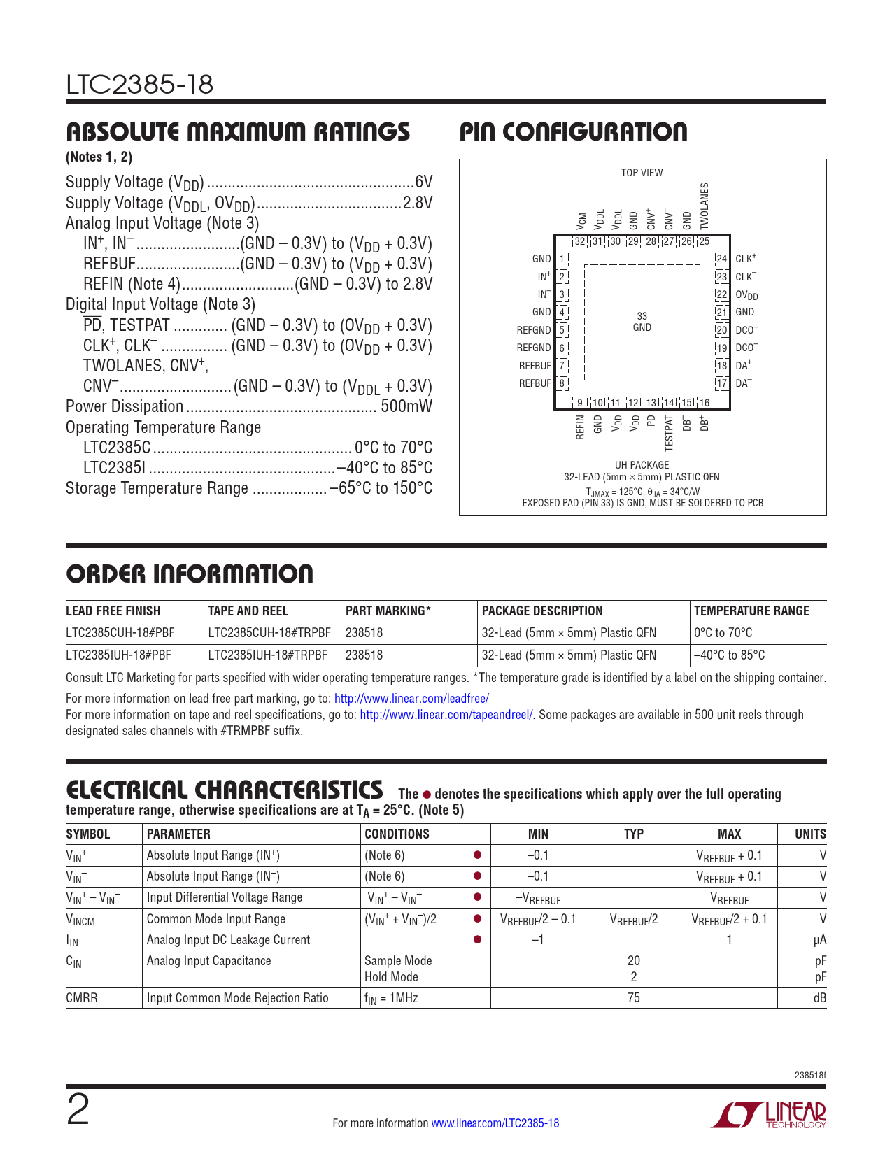 LTC2385CUH-18#PBF LTC2385CUH-18#TRPBF 238518 32-Lead (5mm × 5mm) Plastic QFN 0°C to 70°C LTC2385IUH-18#PBF LTC2385IUH-18#TRPBF 238518 32-Lead (5mm × 5mm) Plastic QFN –40°C to 85°C Consult LTC Marketing for parts specified with wider operating temperature ranges. *The temperature grade is identified by a label on the shipping container. For more information on lead free part marking, go to: http://www.linear.com/leadfree/ For more information on tape and reel specifications, go to: http://www.linear.com/tapeandreel/. Some packages are available in 500 unit reels through designated sales channels with #TRMPBF suffix.