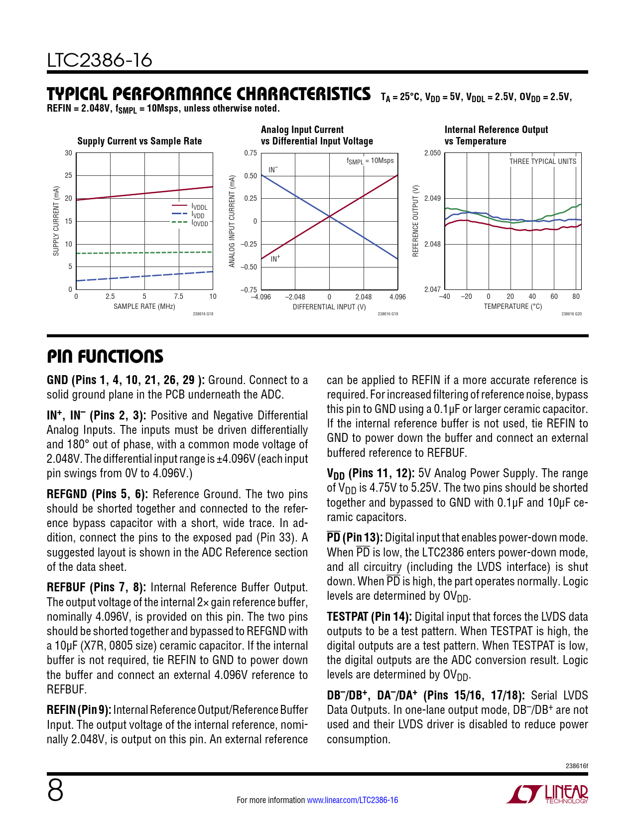 LTC2386-16 TypicalperForMance characTerisTics TA = 25°C, VDD = 5V, VDDL = 2.5V, OVDD = 2.5V,REFIN = 2.048V, fSMPL = 10Msps, unless otherwise noted.Analog Input CurrentInternal Reference OutputSupply Current vs Sample Ratevs Differential Input VDifferential Input V oltageoltagevs Temperature 30 0.75 2.050 fSMPL = 10Msps THREE TYPICAL UNITS IN– 25 0.50 20 0.25 2.049 IVDDL IVDD 15 IOVDD 0 Y CURRENT (mA) 10 –0.25 2.048 SUPPL IN+ REFERENCE OUTPUT (V) 5 ANALOG INPUT CURRENT (mA) –0.50 0 –0.75 2.047 0 2.5 5 7.5 10 –4.096 –2.048 0 2.048 4.096 –40 –20 0 20 40 60 80 SAMPLE RATE (MHz) DIFFERENTIAL INPUT (V) TEMPERATURE (°C) 238616 G18 238616 G19 238616 G20 pin FuncTions GND (Pins 1, 4, 10, 21, 26, 29 ): Ground. Connect to a can be applied to REFIN if a more accurate reference is solid ground plane in the PCB underneath the ADC. required. For increased filtering of reference noise, bypass IN+, IN– (Pins 2, 3): Positive and Negative Differential this pin to GND using a 0.1µF or larger ceramic capacitor. Analog Inputs. The inputs must be driven differentially If the internal reference buffer is not used, tie REFIN to and 180° out of phase, with a common mode voltage of GND to power down the buffer and connect an external 2.048V. The differential input range is ±4.096V (each input buffered reference to REFBUF. pin swings from 0V to 4.096V.) VDD (Pins 11, 12): 5V Analog Power Supply. The range REFGND (Pins 5, 6): Reference Ground. The two pins of VDD is 4.75V to 5.25V. The two pins should be shorted should be shorted together and connected to the refer- together and bypassed to GND with 0.1μF and 10μF ce- ence bypass capacitor with a short, wide trace. In ad- ramic capacitors. dition, connect the pins to the exposed pad (Pin 33). A PD (Pin 13): Digital input that enables power-down mode. suggested layout is shown in the ADC Reference section When PD is low, the LTC2386 enters power-down mode, of the data sheet. and all circuitry (including the LVDS interface) is shut REFBUF (Pins 7, 8): Internal Reference Buffer Output. down. When PD is high, the part operates normally. Logic The output voltage of the internal 2× gain reference buffer, levels are determined by OVDD. nominally 4.096V, is provided on this pin. The two pins TESTPAT (Pin 14): Digital input that forces the LVDS data should be shorted together and bypassed to REFGND with outputs to be a test pattern. When TESTPAT is high, the a 10µF (X7R, 0805 size) ceramic capacitor. If the internal digital outputs are a test pattern. When TESTPAT is low, buffer is not required, tie REFIN to GND to power down the digital outputs are the ADC conversion result. Logic the buffer and connect an external 4.096V reference to levels are determined by OVDD. REFBUF. DB–/DB+, DA–/DA+ (Pins 15/16, 17/18): Serial LVDS REFIN (Pin 9): Internal Reference Output/Reference Buffer Data Outputs. In one-lane output mode, DB–/DB+ are not Input. The output voltage of the internal reference, nomi- used and their LVDS driver is disabled to reduce power nally 2.048V, is output on this pin. An external reference consumption. 238616f 8 For more information www.linear.com/LTC2386-16 Document Outline Features Description Applications Typical Application Absolute Maximum Ratings Pin Configuration Order Information Electrical Characteristics Converter Characteristics Dynamic Accuracy Internal Reference Characteristics Reference Buffer Characteristics Digital Inputs and Digital Outputs Power Requirements ADC Timing Characteristics Typical Performance Characteristics Pin Functions Functional Block Diagram Timing Diagram Applications Information Package Description Typical Application Related Parts
