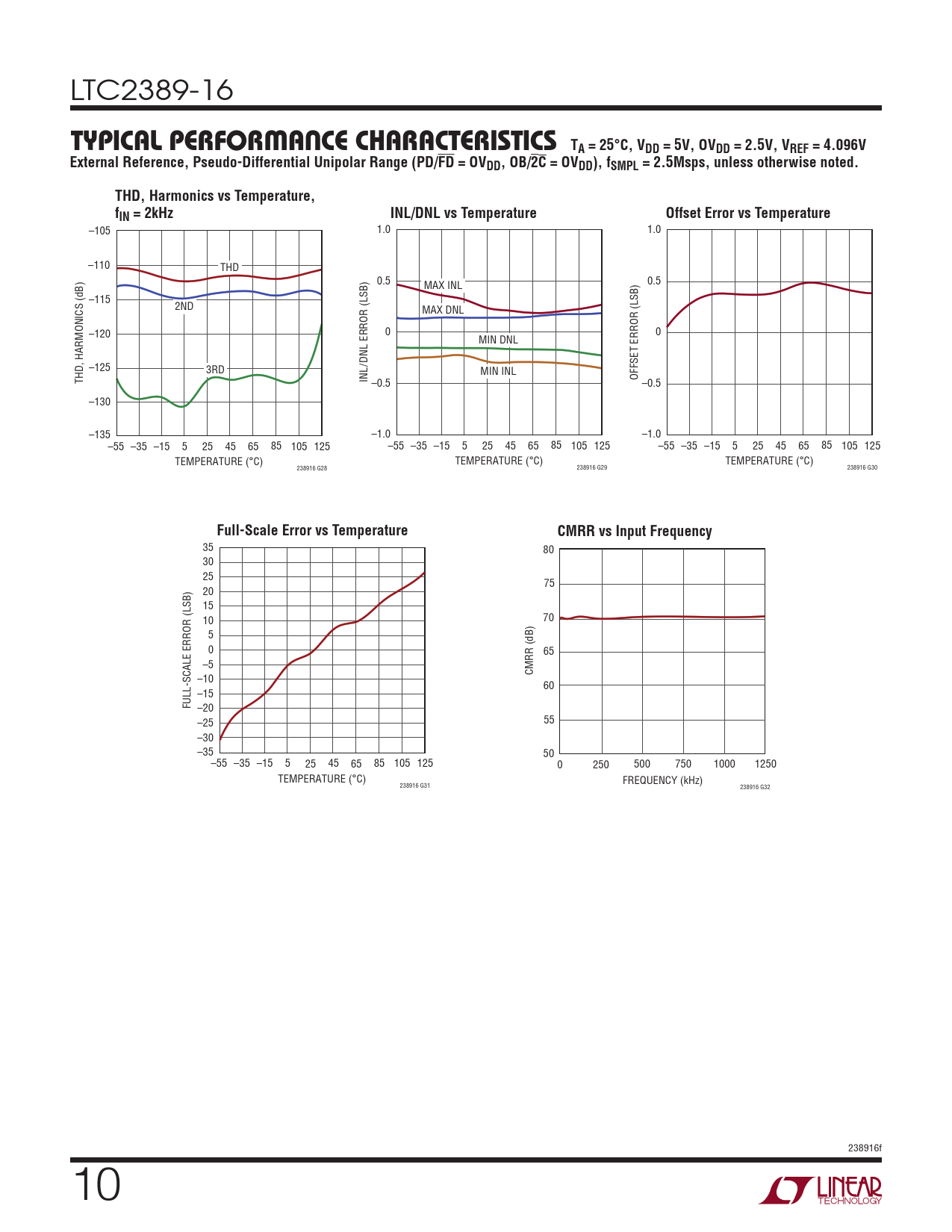 –105 1.0 1.0 –110 THD 0.5 MAX INL 0.5 –115 2ND MAX DNL –120 0 0 MIN DNL –125 3RD /DNL ERROR (LSB) MIN INL THD, HARMONICS (dB) INL OFFSET ERROR (LSB) –0.5 –0.5 –130 –135 –1.0 –1.0 –55 –35 –15 5 25 45 65 85 105 125 –55 –35 –15 5 25 45 65 85 105 125 –55 –35 –15 5 25 45 65 85 105 125 TEMPERATURE (°C) TEMPERATURE (°C) TEMPERATURE (°C) 238916 G28 238916 G29 238916 G30