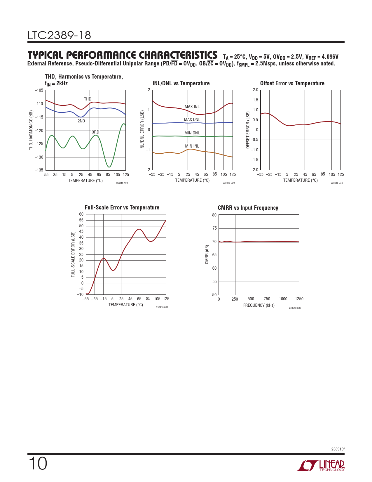 –105 2 2.0 THD 1.5 –110 MAX INL 1 1.0 –115 2ND MAX DNL 0.5 –120 3RD 0 0 MIN DNL –0.5 –125 /DNL ERROR (LSB) MIN INL THD, HARMONICS (dB) INL OFFSET ERROR (LSB) –1 –1.0 –130 –1.5 –135 –2 –2.0 –55 –35 –15 5 25 45 65 85 105 125 –55 –35 –15 5 25 45 65 85 105 125 –55 –35 –15 5 25 45 65 85 105 125 TEMPERATURE (°C) TEMPERATURE (°C) TEMPERATURE (°C) 238918 G28 238918 G29 238918 G30