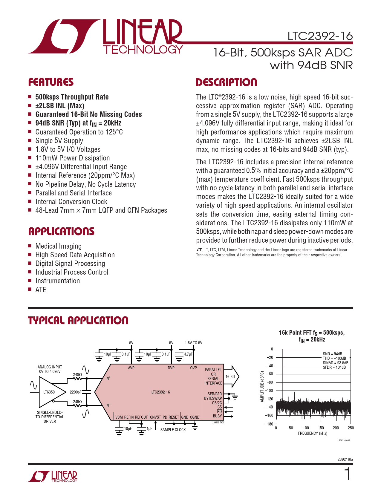 LTC2392-16 16-Bit, 500ksps SAR ADC with 94dB SNR FeaturesDescription n 500ksps Throughput Rate The LTC®2392-16 is a low noise, high speed 16-bit suc- n ±2LSB INL (Max) cessive approximation register (SAR) ADC. Operating n Guaranteed 16-Bit No Missing Codes from a single 5V supply, the LTC2392-16 supports a large n 94dB SNR (Typ) at fIN = 20kHz ±4.096V fully differential input range, making it ideal for n Guaranteed Operation to 125°C high performance applications which require maximum n Single 5V Supply dynamic range. The LTC2392-16 achieves ±2LSB INL n 1.8V to 5V I/O Voltages max, no missing codes at 16-bits and 94dB SNR (typ). n 110mW Power Dissipation The LTC2392-16 includes a precision internal reference n ±4.096V Differential Input Range with a guaranteed 0.5% initial accuracy and a ±20ppm/°C n Internal Reference (20ppm/°C Max) (max) temperature coefficient. Fast 500ksps throughput n No Pipeline Delay, No Cycle Latency with no cycle latency in both parallel and serial interface n Parallel and Serial Interface modes makes the LTC2392-16 ideally suited for a wide n Internal Conversion Clock variety of high speed applications. An internal oscillator n 48-Lead 7mm × 7mm LQFP and QFN Packages sets the conversion time, easing external timing con- siderations. The LTC2392-16 dissipates only 110mW at applications 500ksps, while both nap and sleep power-down modes are provided to further reduce power during inactive periods. n Medical Imaging L, LT, LTC, LTM, Linear Technology and the Linear logo are registered trademarks of Linear n High Speed Data Acquisition Technology Corporation. All other trademarks are the property of their respective owners. n Digital Signal Processing n Industrial Process Control n Instrumentation n ATE typical application16k Point FFT fS = 500ksps,fIN = 20kHz 5V 5V 1.8V TO 5V 0 10µF 0.1µF 10µF 0.1µF 4.7µF SNR = 94dB –20 THD = –103dB SINAD = 93.5dB ANALOG INPUT AVP DVP OVP –40 PARALLEL SFDR = 104dB 0V TO 4.096V 249Ω OR –60 IN+ SERIAL 16 BIT INTERFACE –80 LT6350 2200pF LTC2392-16 –100 SER/PAR BYTESWAP –120 249Ω OB/2C AMPLITUDE (dBFS) IN– CS –140 SINGLE-ENDED- RD TO-DIFFERENTIAL BUSY VCM REFIN REFOUT CNVST PD RESET GND OGND –160 DRIVER 239216 TA01 –180 10µF 1µF SAMPLE CLOCK 0 50 100 150 200 250 FREQUENCY (kHz) 239216 G08 239216fa 1 Document Outline Features Applications Description Typical Application Absolute Maximum Ratings Pin Configuration Order Information Analog Input Converter Characteristics Dynamic Accuracy Internal Reference Characteristics Digital Inputs and Digital Outputs Power Requirements Timing Characteristics Typical Performance Characteristics Pin Functions Functional Block Diagram Timing Diagrams Applications Information Package Description Revision History Typical Application Related Parts