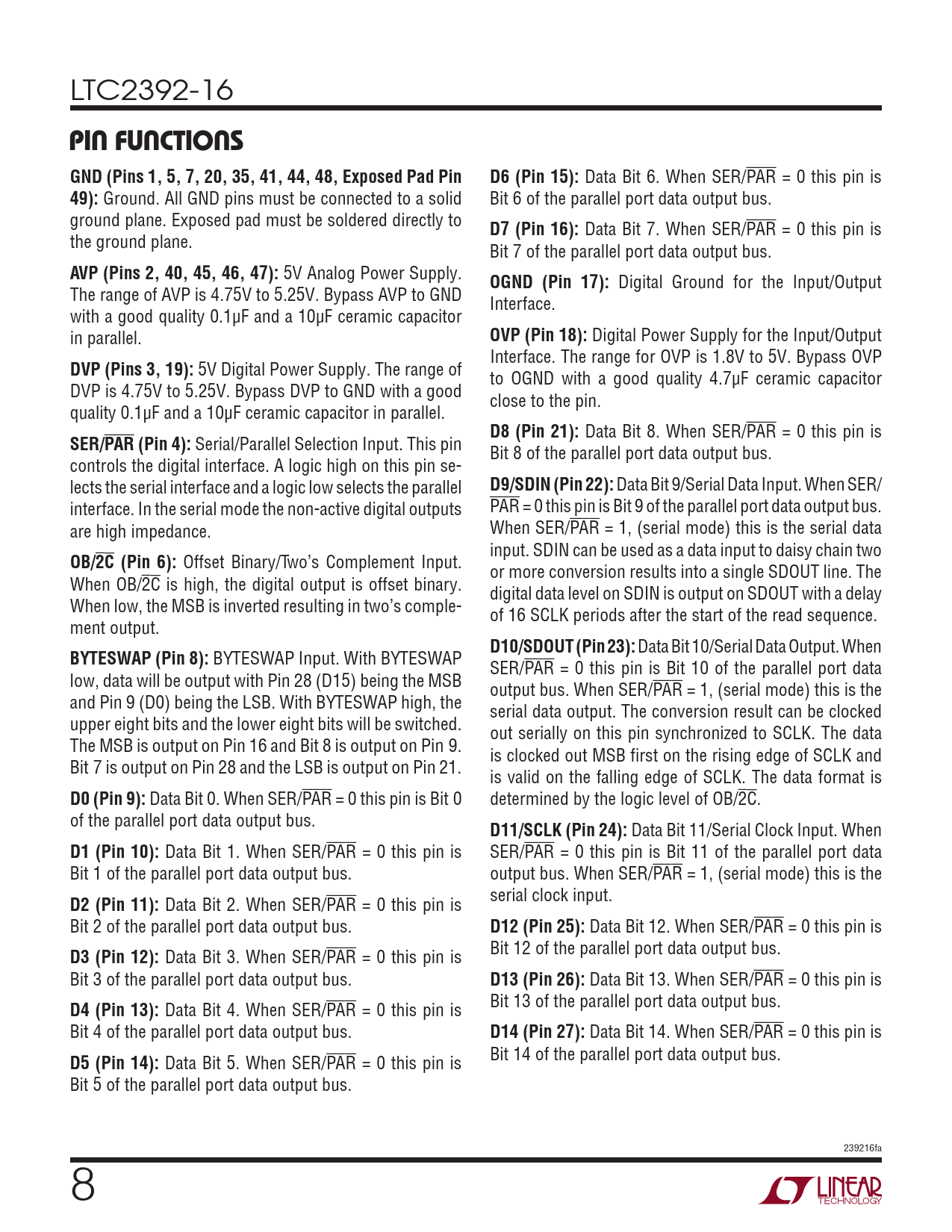 Data Bit 5. When SER/PAR = 0 this pin is Bit 14 of the parallel port data output bus. Bit 5 of the parallel port data output bus. 239216fa 8 Document Outline Features Applications Description Typical Application Absolute Maximum Ratings Pin Configuration Order Information Analog Input Converter Characteristics Dynamic Accuracy Internal Reference Characteristics Digital Inputs and Digital Outputs Power Requirements Timing Characteristics Typical Performance Characteristics Pin Functions Functional Block Diagram Timing Diagrams Applications Information Package Description Revision History Typical Application Related Parts